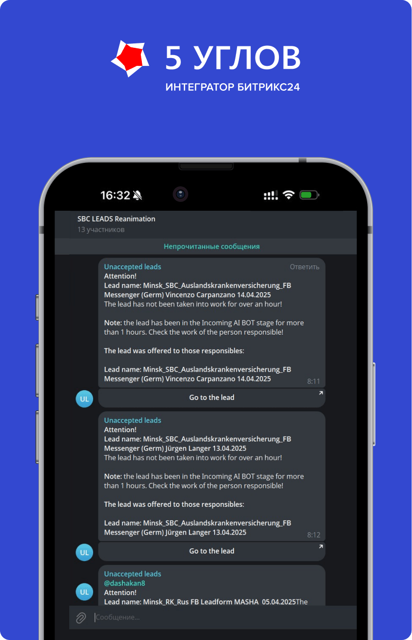 Добавили систему отслеживания задержек по стадиям. Если лид слишком долго не берётся в работу или застрял на одном из этапов, в CRM создается замечание. Параллельно Telegram-бот отправляет уведомление ответственному менеджеру с указанием проблемы. Руководитель получает сводный отчет с ссылками на просроченные сделки.