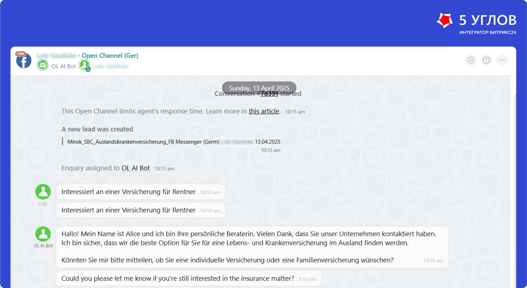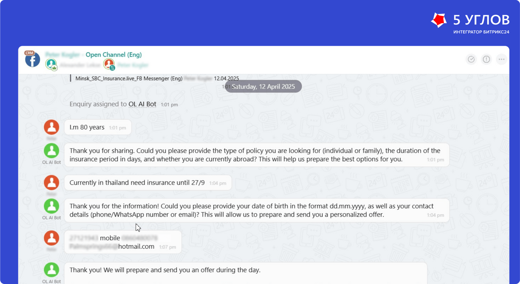 Бот уточняет, какой именно страховкой интересуется клиент (медицинская, туристическая, долгосрочная и т.д.), собирает необходимые контактные данные и другие важные параметры. Затем автоматически передаёт информацию в CRM и переводит лида на распределение по нужной логике. Менеджер получает уже частично готовую карточку со всей базовой информацией.