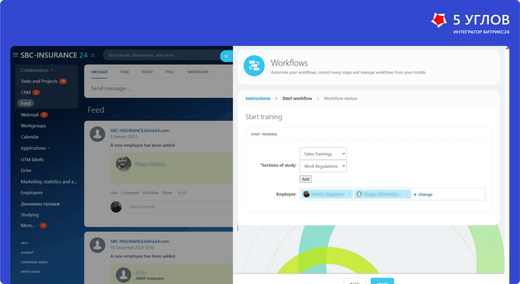 Настроили запуск обучения из ленты новостей в Битрикс24. Руководитель выбирает группу сотрудников и нужный набор материалов — система создаёт карточки обучения автоматически и привязывает их к каждому сотруднику. Так можно быстро запускать адаптацию новых менеджеров, рассылать обновления и контролировать изучение в реальном времени.