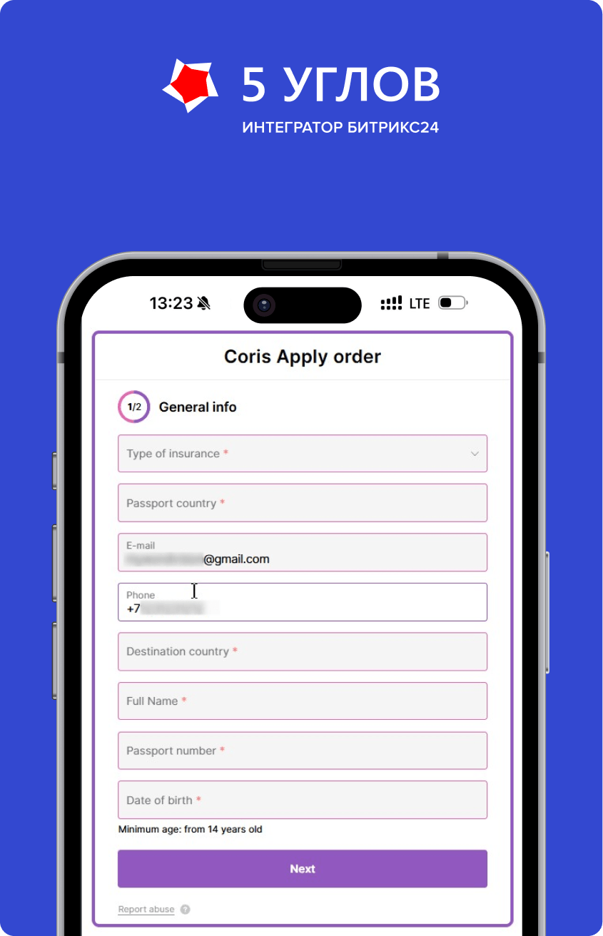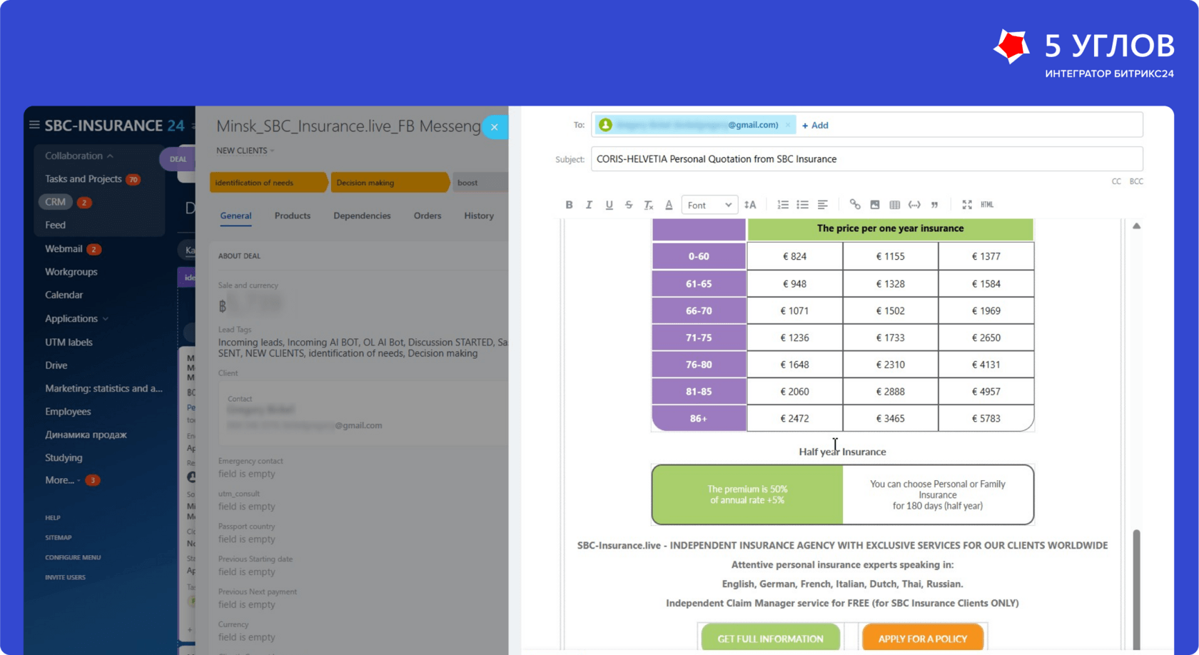 Сделали красивый HTML-шаблон, в котором автоматически рассчитывается стоимость страховки на основе данных из сделки. Письмо содержит кнопку, ведущую в персонализированную CRM-форму, где клиент может самостоятельно оформить страховку. Вся информация из формы моментально попадает в сделку — без участия менеджера.