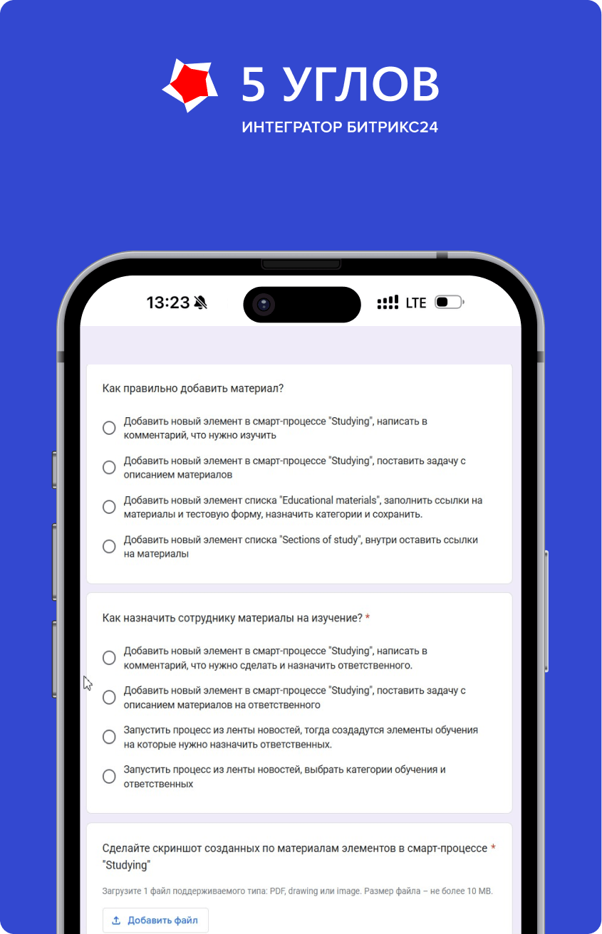 В рамках обучающей системы мы настроили механизм тестирования с помощью Google Форм. Каждый учебный материал в HRM-модуле может сопровождаться тестом, привязанным к карточке сотрудника.