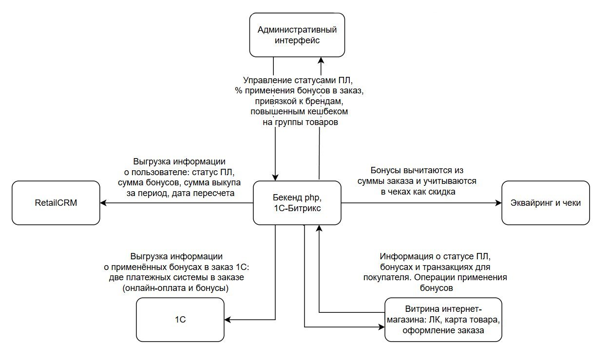Решили сохранить бэкэнд для лояльности в 1С-Битрикс, чтобы была возможность быстро масштабировать механики начисления и списания бонусов на уровне разработки. При этом данные лояльности (статусы, бонусы, транзакции) передавать в RetailCRM для аналитики и сегментации. А также обязательно сохранить существующую логику проброса бонусов в заказы 1С и в чеки.