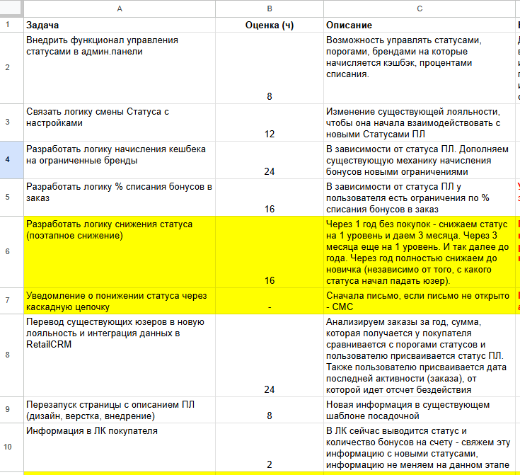 При этом построить новую лояльность: 6 уровней, логика перехода и отката назад, привязка кешбека к брендам, повышенный кешбек, % списания в заказ, отдельные условия на распродажные товары и при применении промокодов. Плюс заложиться на будущее расширение механик ПЛ. Начали с разбора бизнес-требований, подсветили узкие места и нестыковки. Провели несколько встреч с бизнес-заказчиком, где путем обсуждений пришли к финальным требованиям. Далее декомпозировали на этапы, по каждому проработали ТЗ, план внедрения и оценили трудозатраты. По сложным блокам прописали риски и план тестов. Провели все подготовительные работы за неделю.