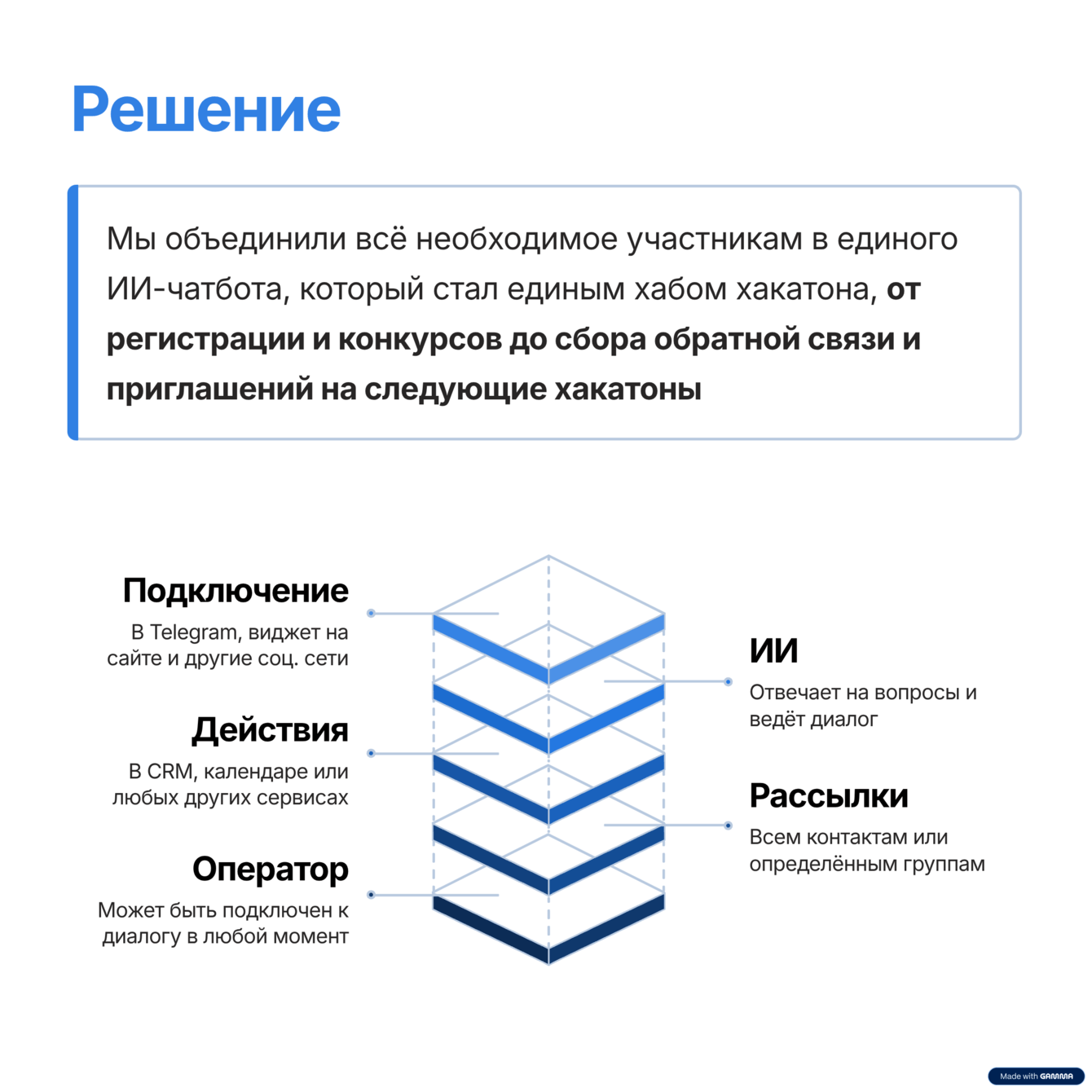 Мы объединили всё необходимое участникам в единого ИИ-чатбота, который стал единым хабом хакатона, от регистрации и конкурсов до сбора обратной связи и приглашений на следующие хакатоны