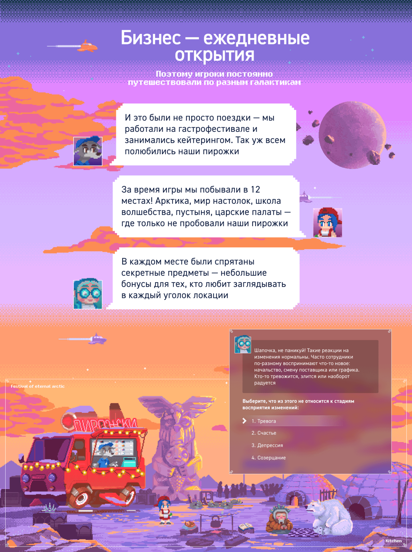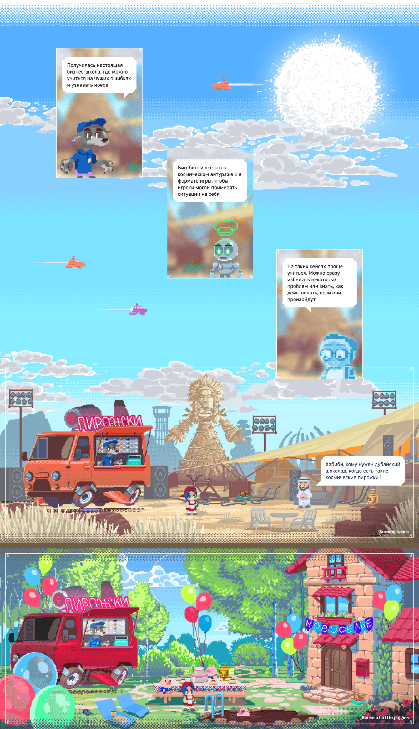 Мы наполнили историю множественными культурными аллюзиями и отсылками: робот Пьеро, голограмма бабушки, кольцо всевластия, орки, шейхи и пирожки с молекулярными ингредиентами. Всё это делает процесс обучения лёгким и захватывающим, стимулируя внутреннюю мотивацию участников.