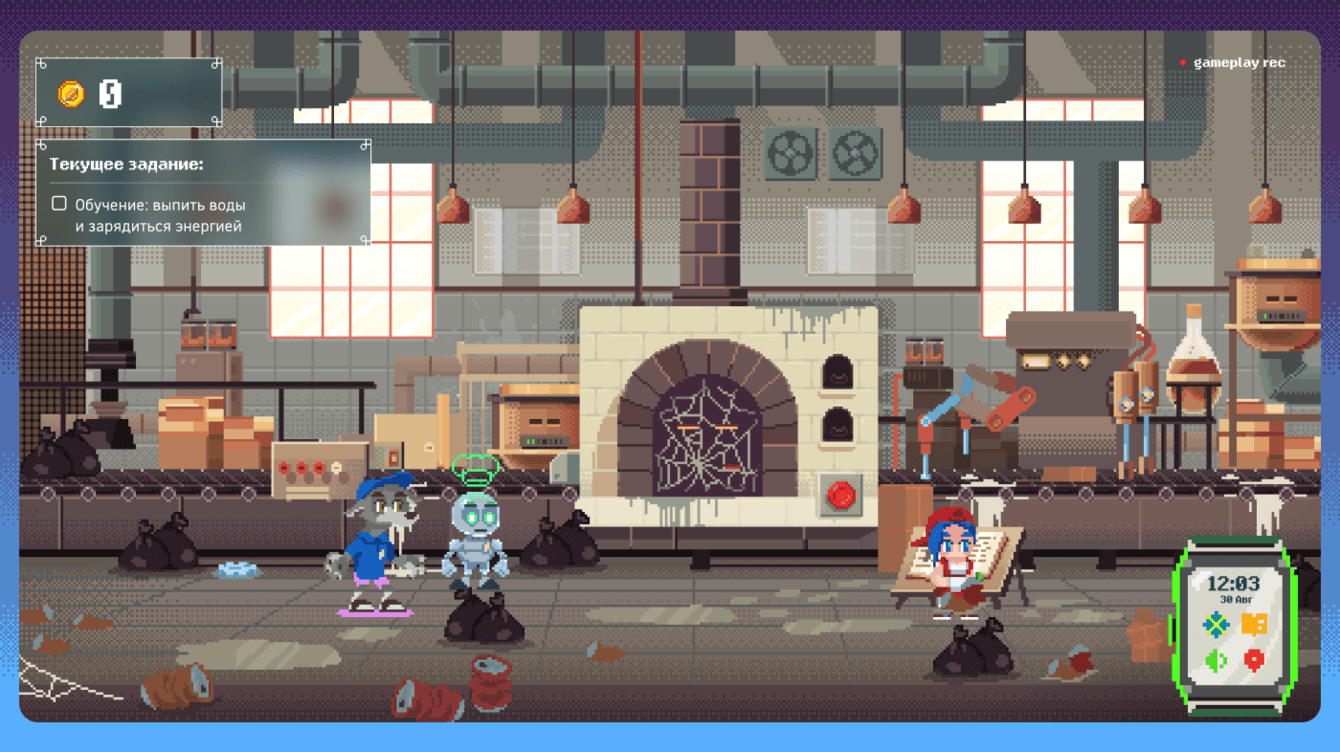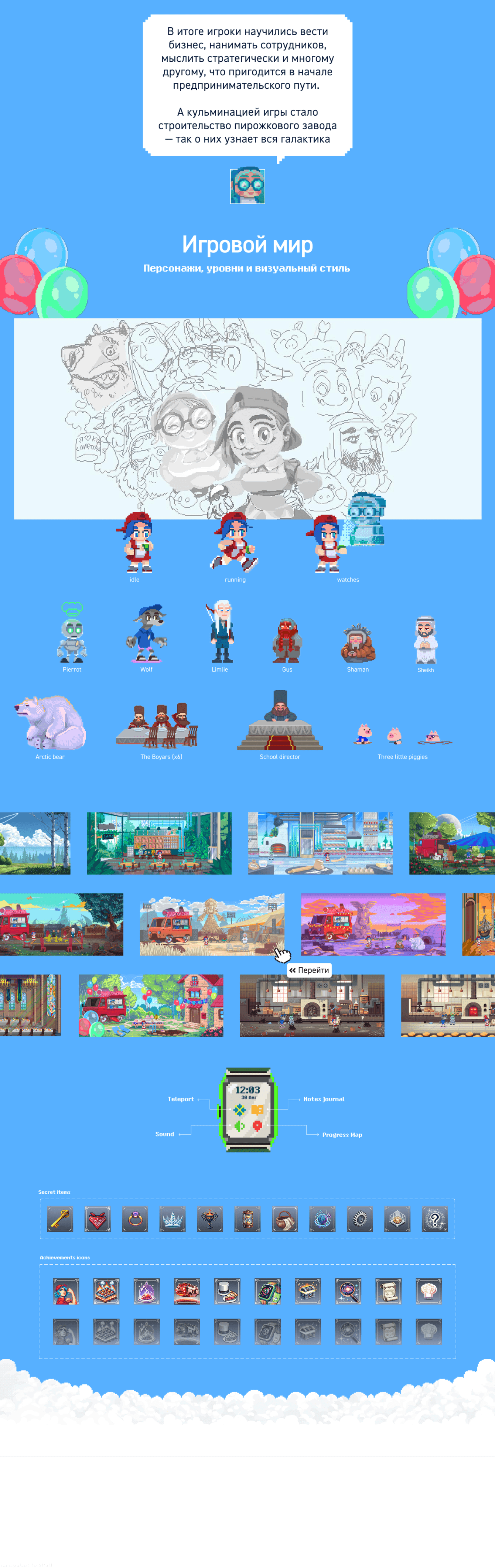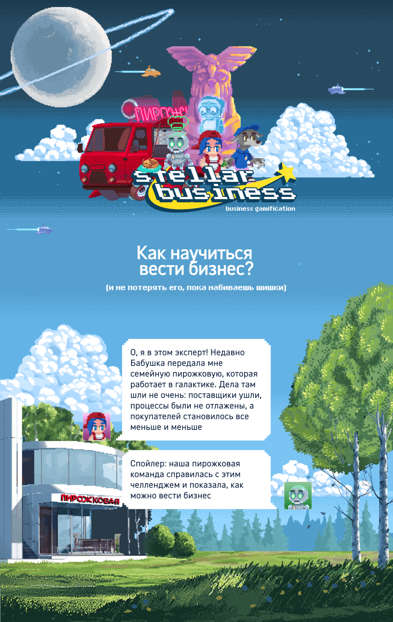 Проект стартовал с краткого брифа на обучающую игру и вырос в полноценную бизнес-симуляцию с развитым сюжетом, художественным миром и сложной механикой.