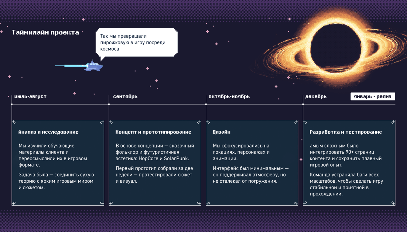 Работа над проектом заняла несколько месяцев и потребовала взаимодействия команды дизайнеров, сценаристов, методологов и программистов.
