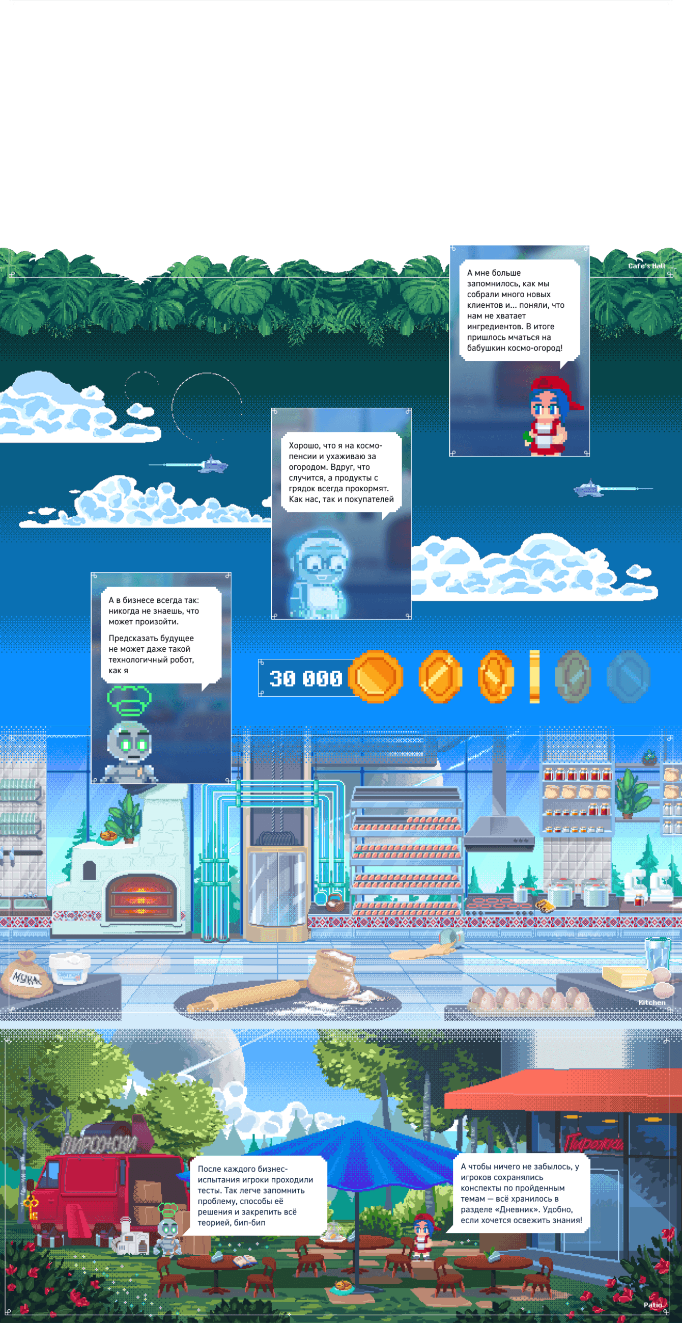 Анимации, интерфейсы и персонажи собраны в единую эстетику позитивного будущего, где обучение — это приключение.