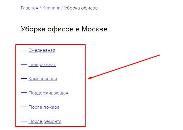 сквозная перелинковка на страницы услуг через блок «Дополнительные услуги»