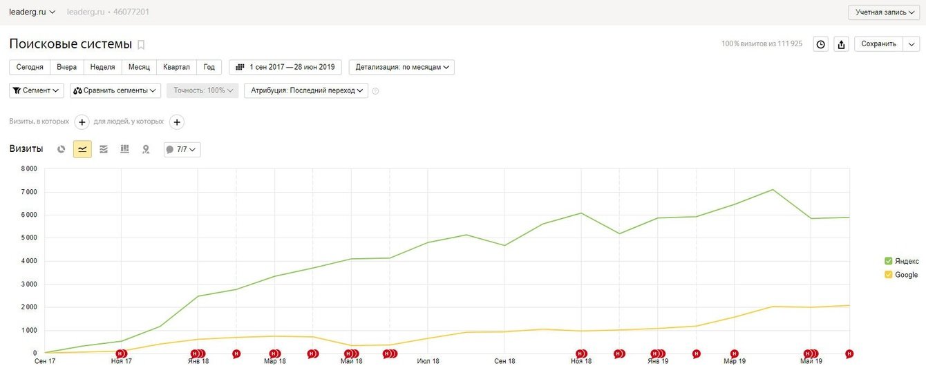 С сентября 2017 года по апрель 2019 года увеличили посещаемость сайта из поисковых систем в 25 раз: с 362 до 9333 человек в месяц.