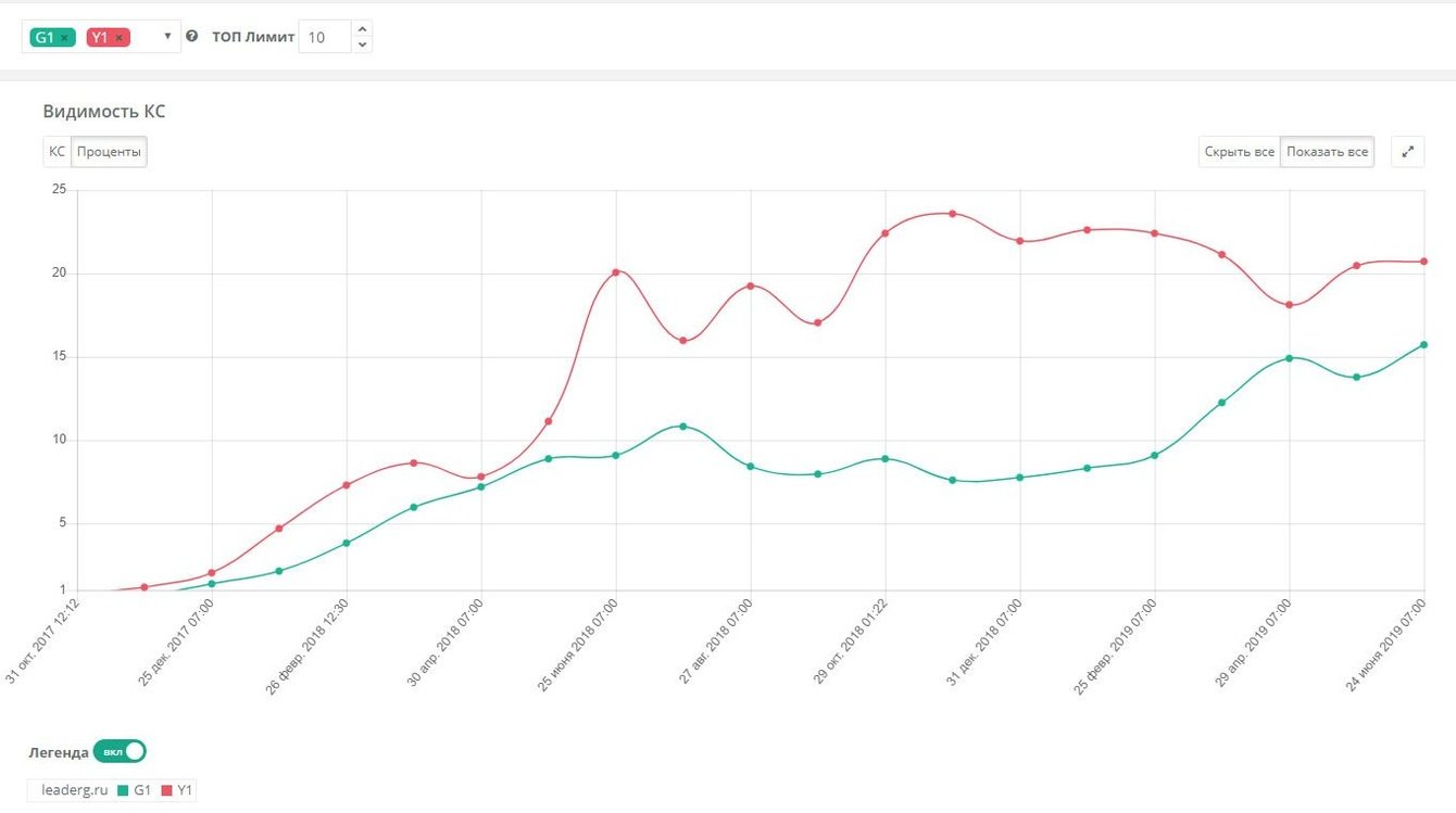 На сегодняшний день проект обладает следующими показателями видимости по ключевым запросам в ТОП-10 Яндекс 21%, в Google – 16%; в ТОП-30 Яндекс 41% запросов, в Google – 33%.