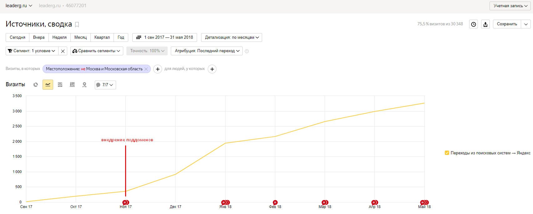 После проведения всех настроек и индексации поддоменов получили прирост трафика в Яндексе из регионов в 9 раз (через полгода).