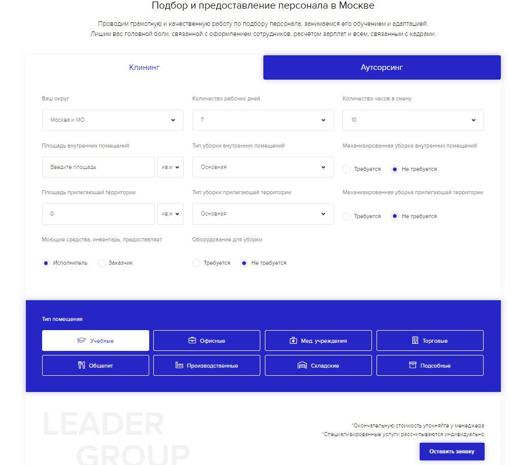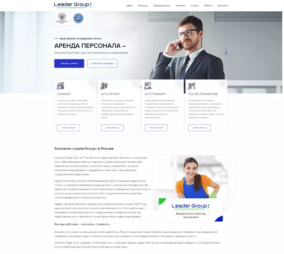 Leaderg.ru вошел в ТОП-10 сайтов по тематике «клининг, аутстаффинг, аутсорсинг персонала», а также занимает позиции на первой странице поисковой выдачи по популярным и конкурентным запросам.
