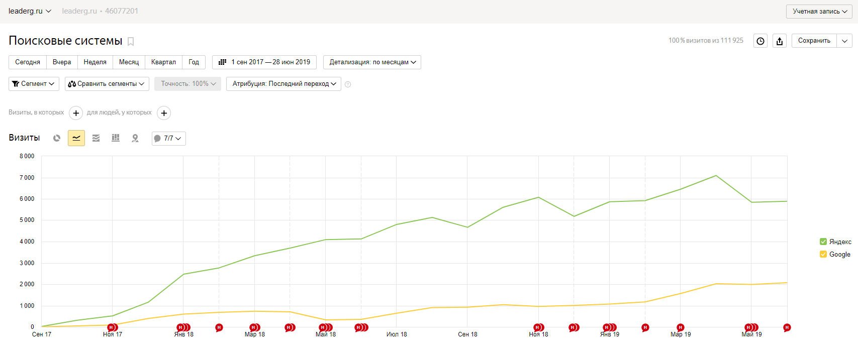 С сентября 2017 года по апрель 2019 года увеличили посещаемость сайта из поисковых систем в 25 раз: с 362 до 9333 человек в месяц.