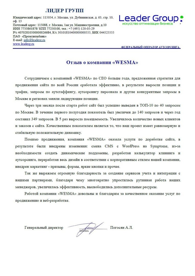 Сотрудничаем с компанией «WESMA» по СЕО больше года, предложенная стратегия для продвижения сайта по всей России сработала эффективно, в результате выросли позиции и трафик, запросы по аутстаффингу, аутсорсингу персонала и другие конкурентные запросы в Москве и регионах заняли лидирующие позиции.