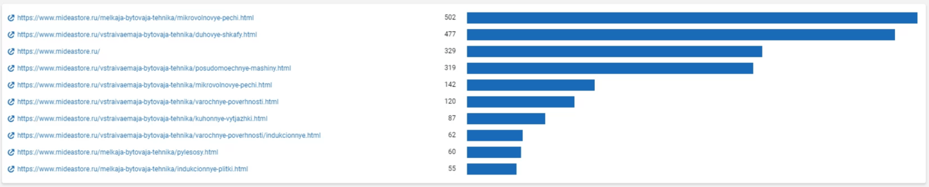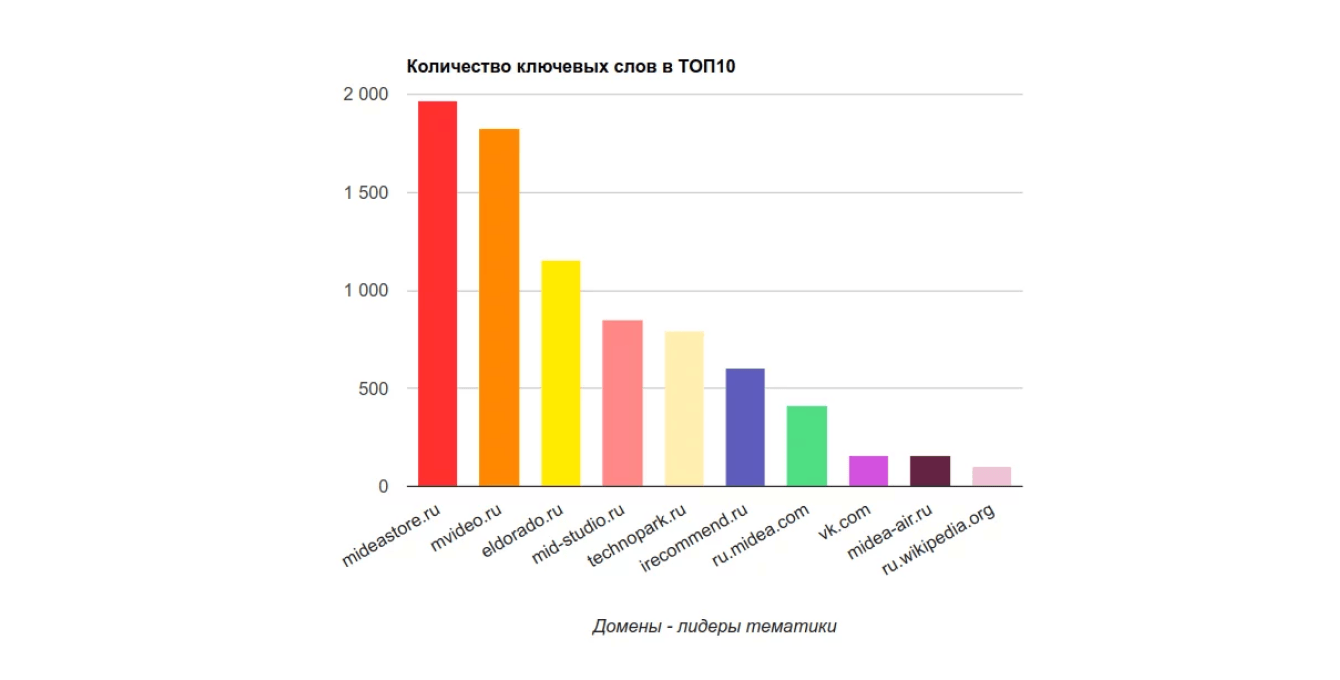 Домен является лидером тематики по количеству ключевых слов в топ-10, опережая mvideo.ru и eldorado.ru: