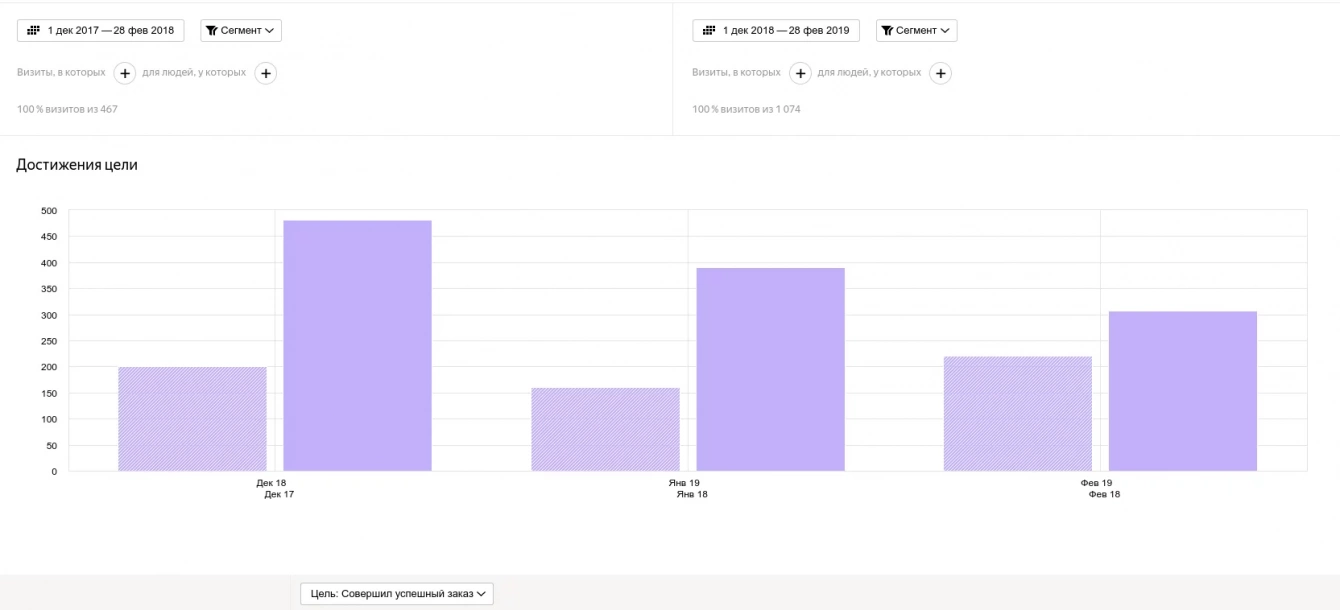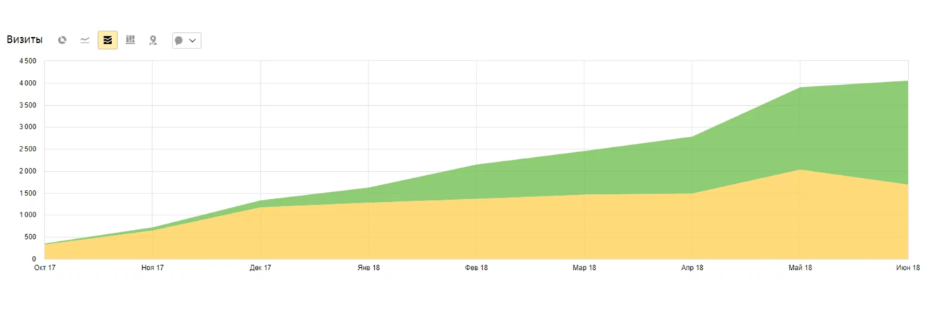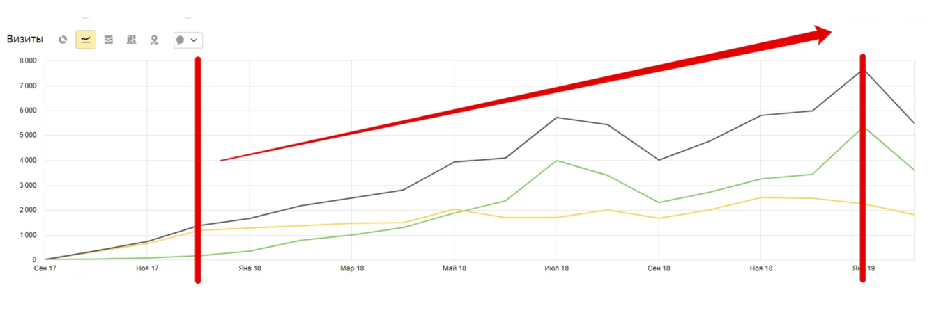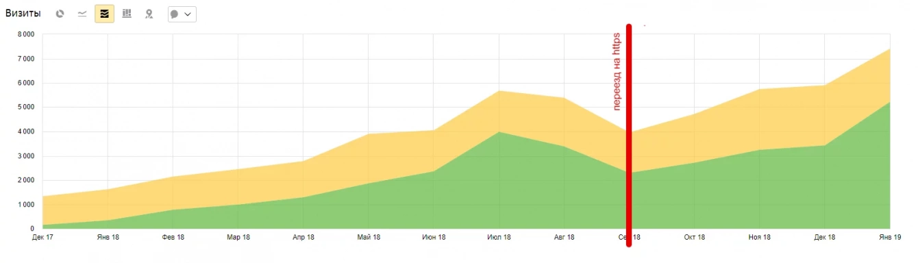 Так выглядит итоговое увеличение посещаемости за год работы. На нем наглядно отображено проседание, связанное с переездом на https протокол:
