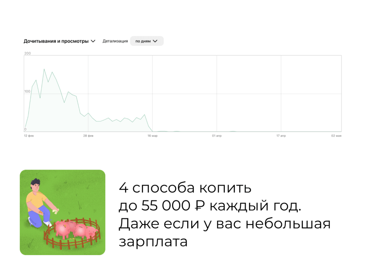 По такому принципу у нас вышли материалы про отказ от алкоголя, способы накопления и похудение. Дзен приносит стабильные 10 000 дочитываний в месяц.