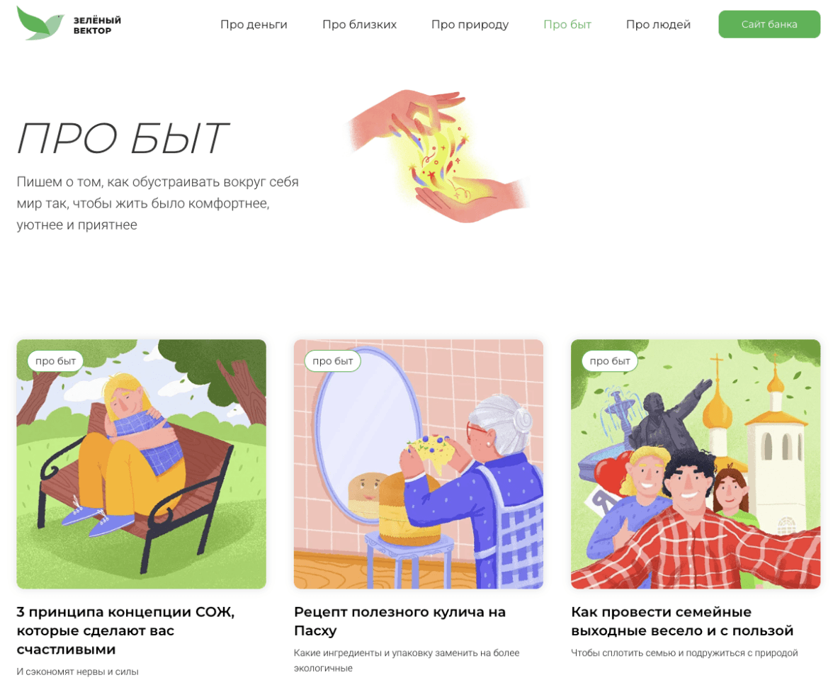 В 2022 году мы запустили бренд-медиа «Зелёный вектор» для банка «Центр-инвест». Это нужно, чтобы повышать brand-awareness и рассказывать аудитории об ESG-позиционировании и экологичности банка.