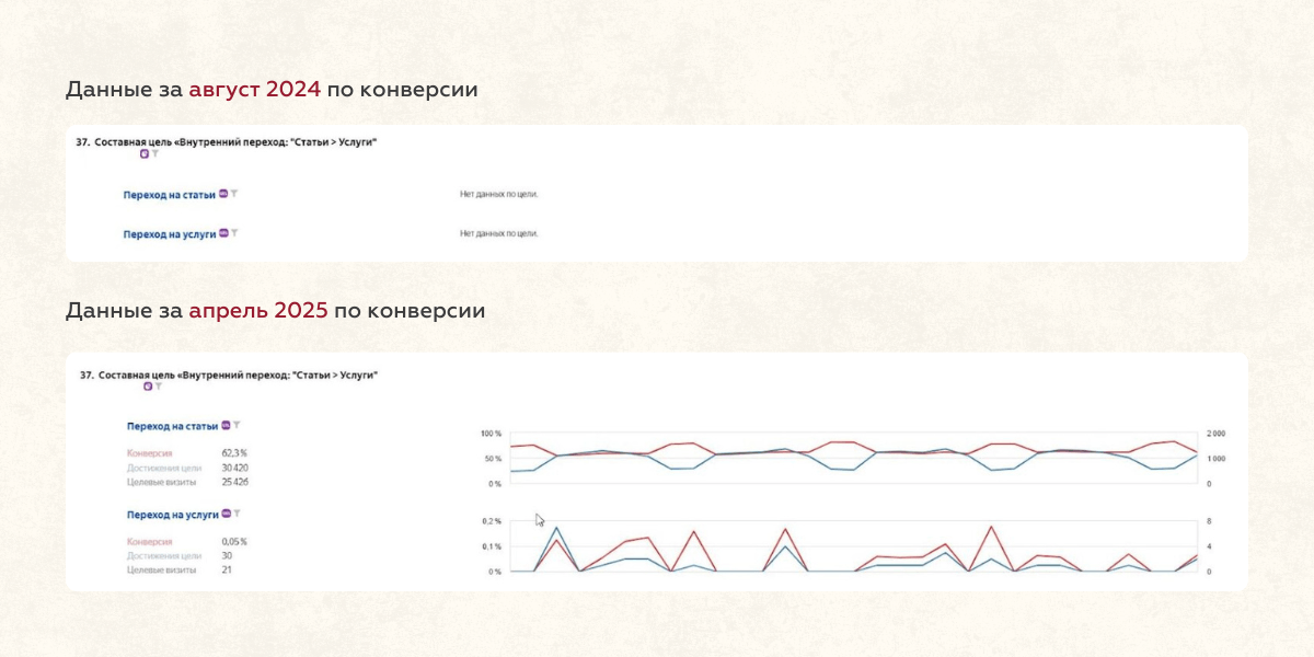 ➡️ Конверсия по переходам из информационного раздела на коммерческие страницы выросла и теперь составляет около 20-30 целевых визитов в месяц.