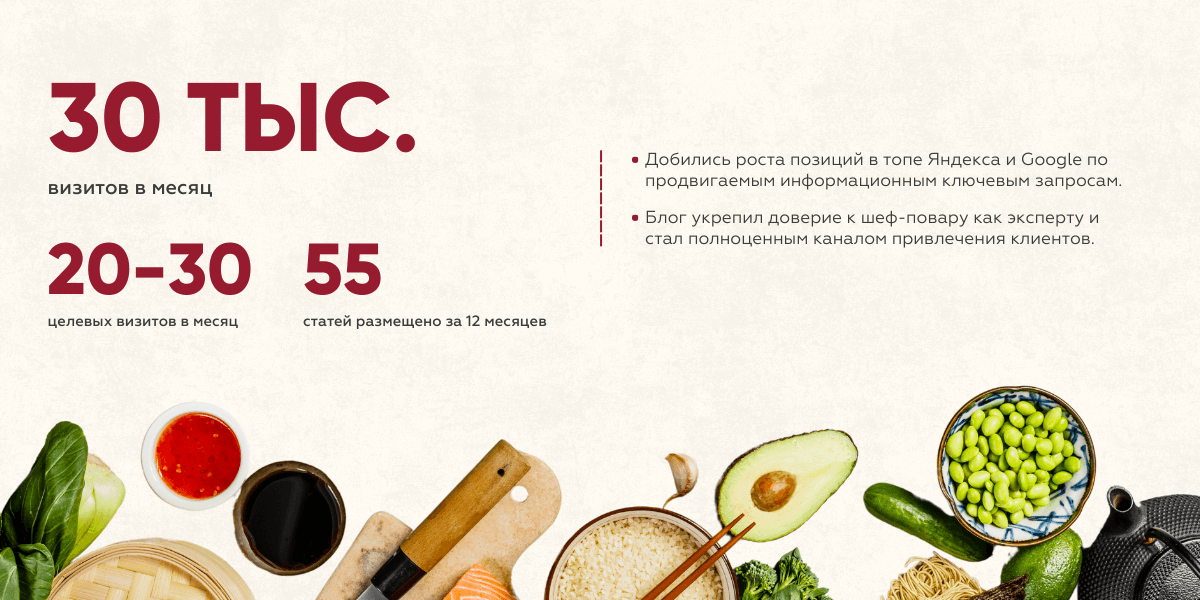 За помощью в продвижении к нам в студию пришел шеф-повар. За много лет работы он накопил множество рецептов блюд и кулинарных лайфхаков. У клиента уже был собственный сайт, но он был похож на визитку, нежели на целостную площадку для привлечения аудитории. Его уникальные знания стали основной для создания структуры сайта и стратегии продвижения.