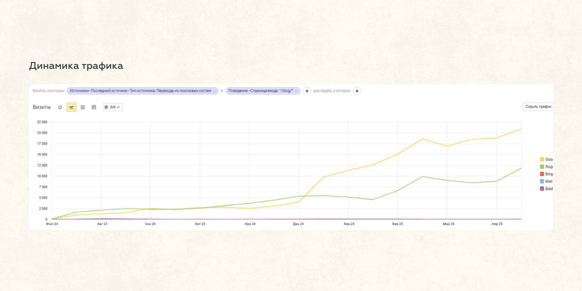 ✅ Регулярная проверка результатов. Для оценки эффективности продвижения мы ежемесячно проводили постапдейтный аудит всех важных показателей. Если фиксировались просадки по трафику или позициям, мы корректировали стратегию и проводили дополнительную проверку через Яндекс Метрику.