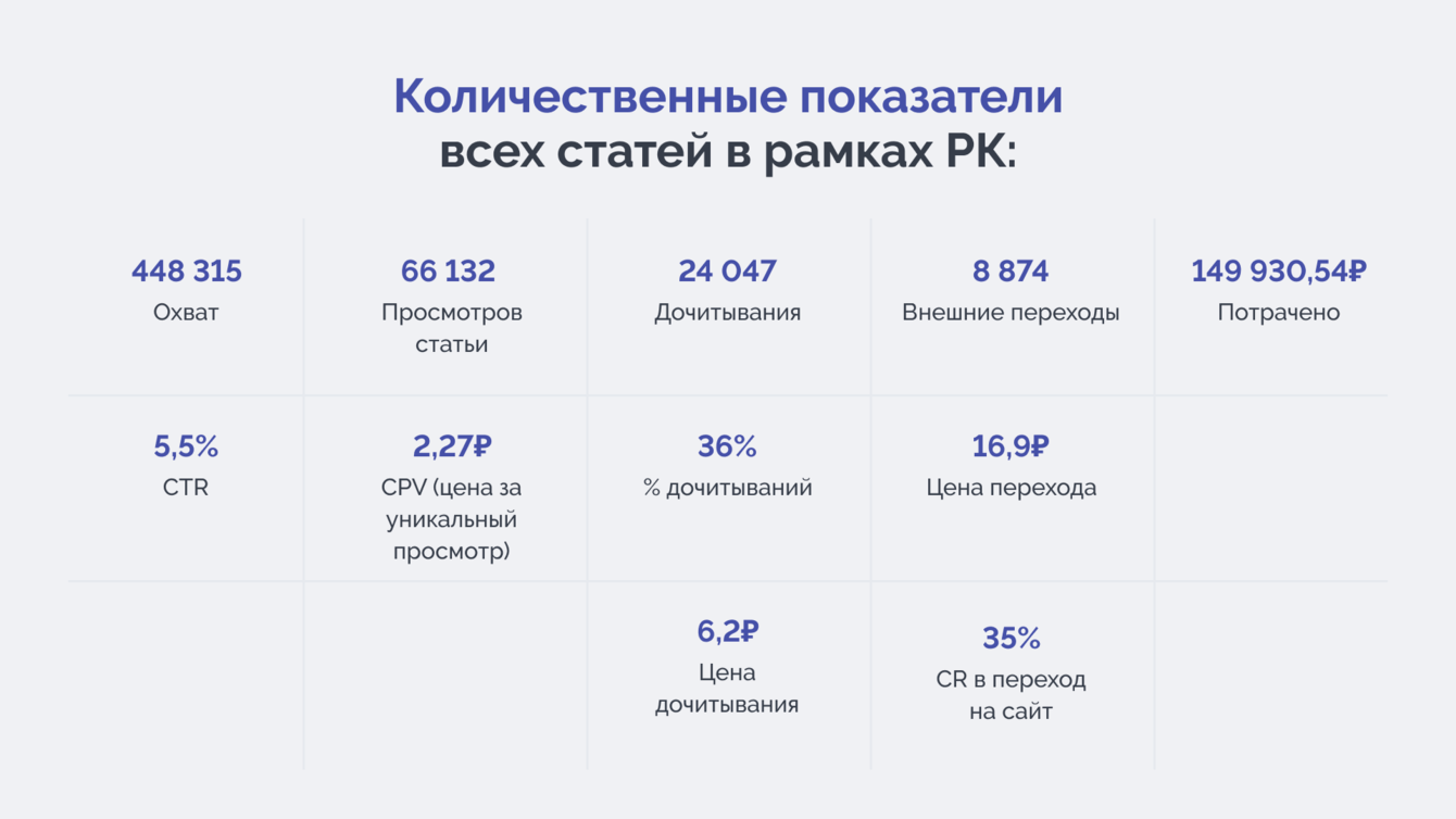 В нашем случае цена этой метрики составила 6,2 рубля, а общий процент дочитываний — 36%. Читать блог на Дзене M.Reason оказалось интереснее, чем некоторых fashion-блогеров Важно, что подобных показателей мы добились, опубликовав 10 статей за месяц с охватом в 66 000 уникальных просмотров.