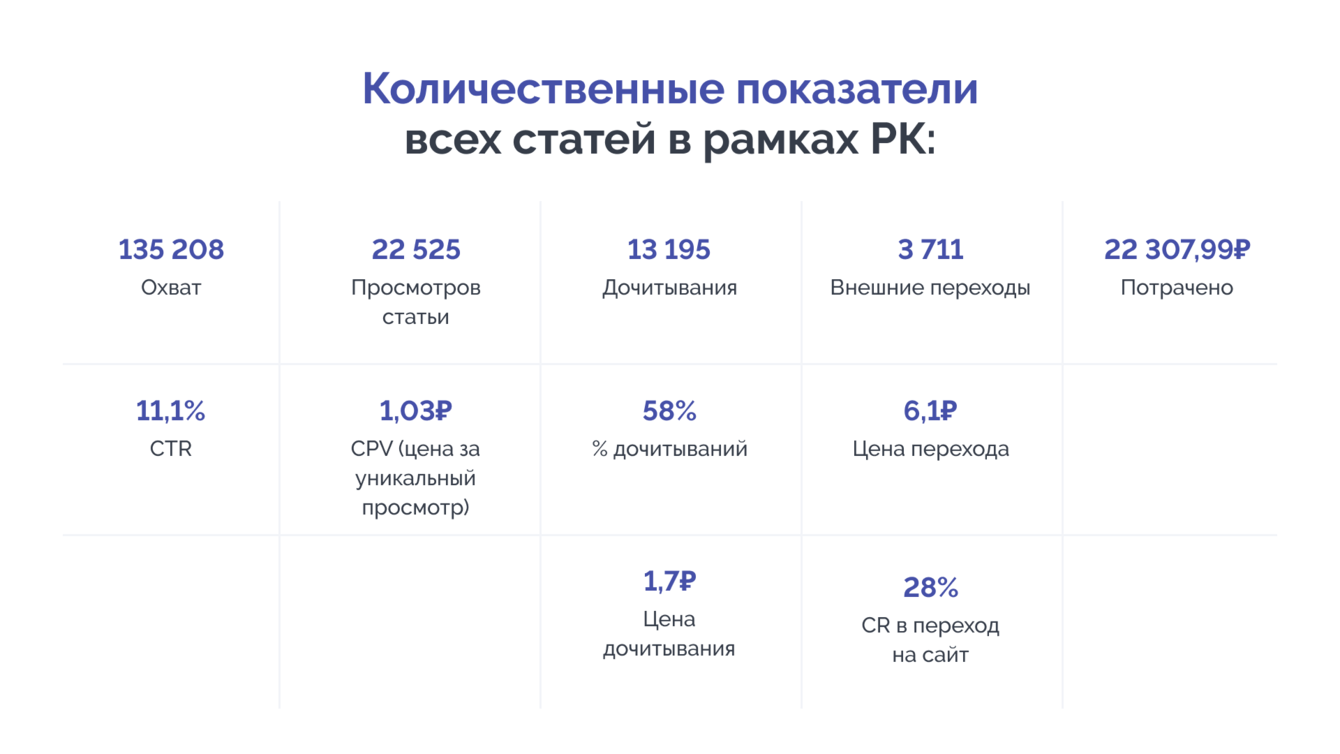 Всего четыре, но очень профессиональных статьи от Hola Agency сработали эффективнее, чем другие рекламные инструменты. СR в переход на сайт — 28%, при этом другие медийные каналы в среднем демонстрируют 10%. В сравнении с остальными соцсетями пользователи на 1,5 минуты дольше проводили время на сайте — это говорит о высоком качестве трафика.