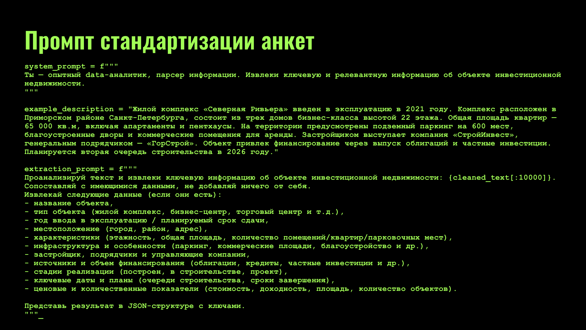 · полученные данные преобразовывались в стандартизированные анкеты участников с помощью специально составленного промпта. Очистка обеспечивает сопоставимость данных и удобство последующего анализа.