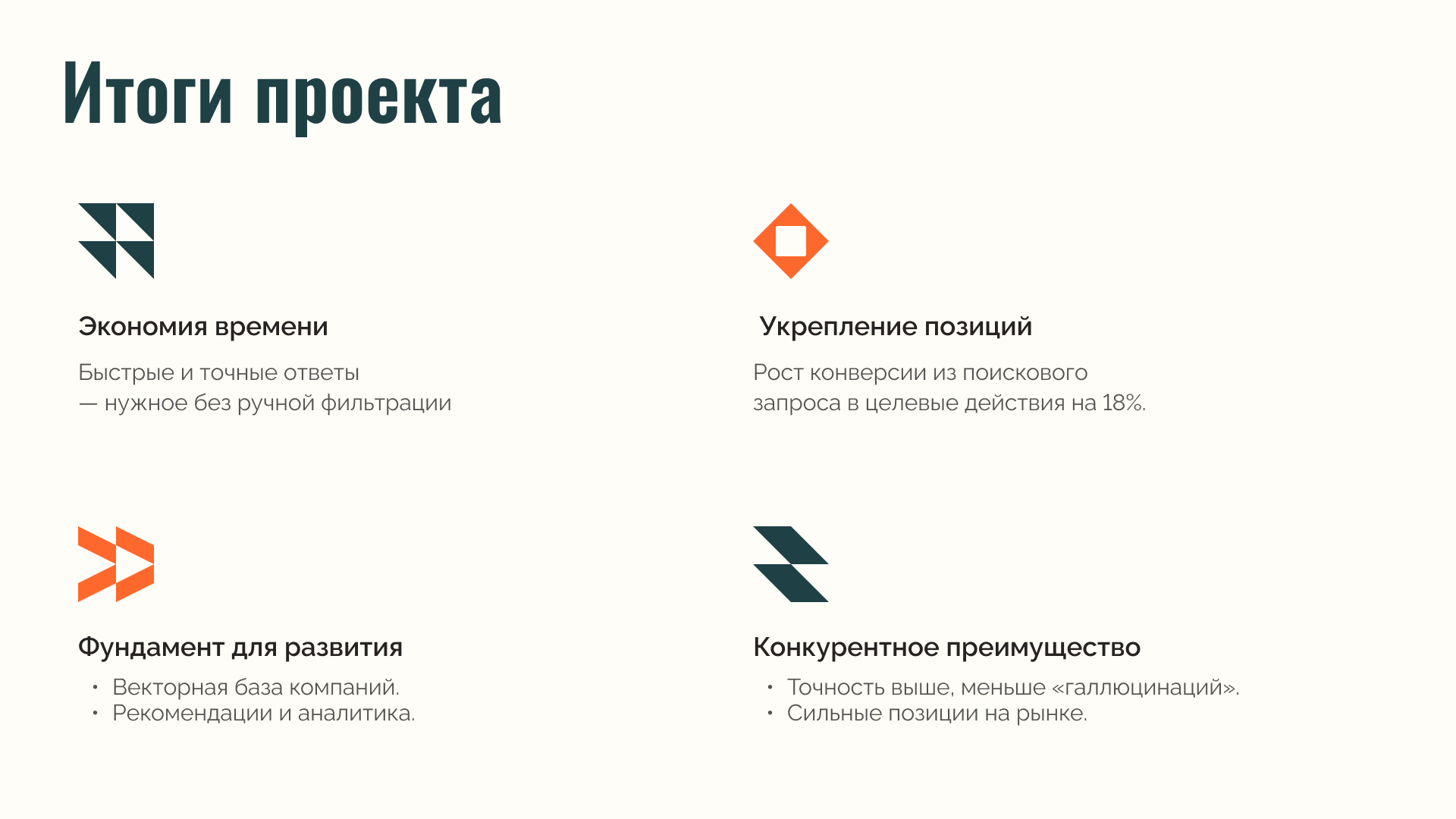 ИИ после своего громкого появления постепенно становится обычным рабочим инструментом. Однако, он поменял многое из того, что раньше казалось незыблемым. Внедрение интеллектуального поиска позволяет задавать запросы не ограничиваясь простым названием компании или ее ИНН. Когда данные собраны из разных источников и объединены с помощью RAG, это открывает для бизнеса новые возможности. А пользовательский опыт — особенно в сфере получения достоверной информации — становится удобнее и качественнее. Работа над проектом принесла нашей команде ценный опыт, а Заказчику дала инструмент, который стал его конкурентным преимуществом.