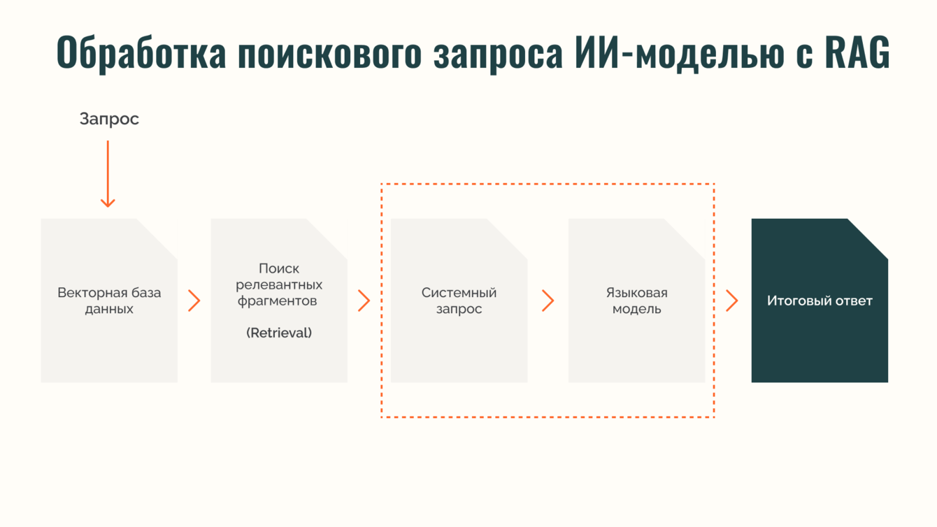 · Извлеченные данные вместе с запросом передаются в языковую модель, которая формирует итоговый ответ на основе фактической информации из базы.