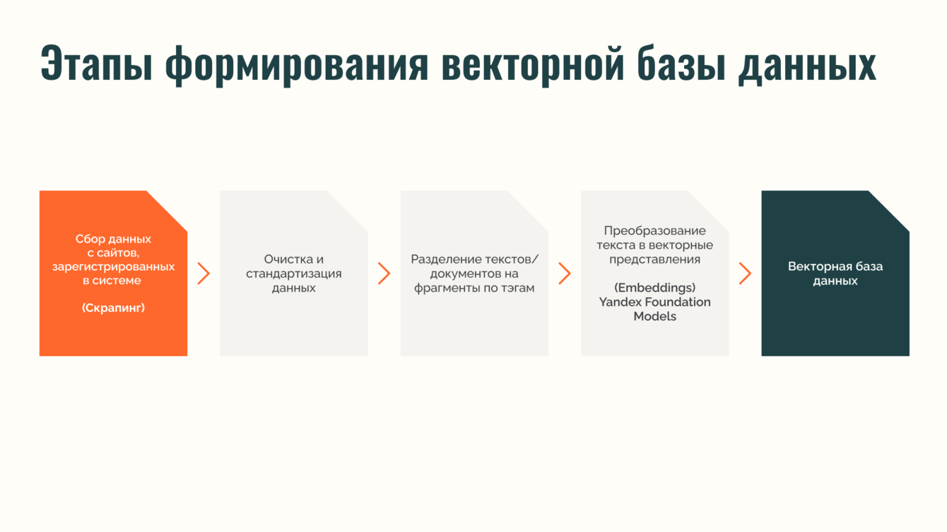 · каждый подготовленный блок данных преобразовывался в векторное представление (эмбеддинг) с помощью модели YandexGPT PRO и сохранялся в специализированное векторное хранилище ChromaDB. Это обеспечивало высокую скорость поиска по смысловому сходству.