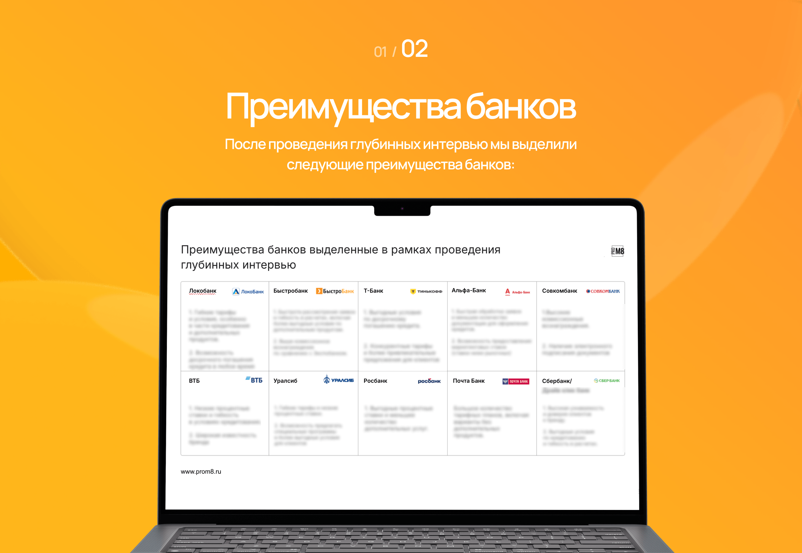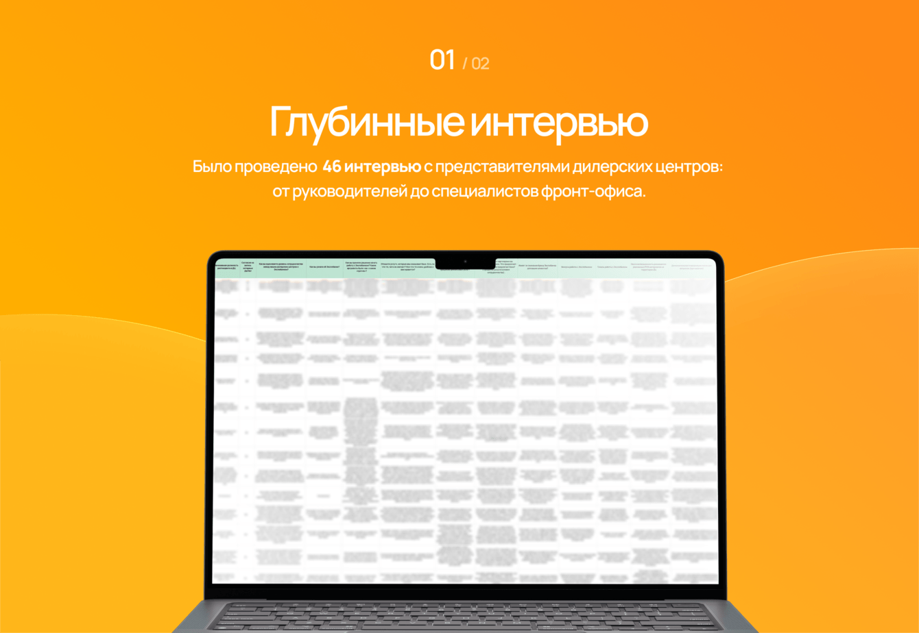 Провели 46 интервью с представителями дилерских центров: от руководителей до специалистов фронт-офиса. Это был честный разговор о том, что реально влияет на продажи, чего не хватает для продвижения продуктов банка, как конкуренты выигрывают доверие, и что вызывает сопротивление у клиентов.