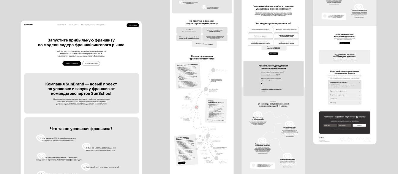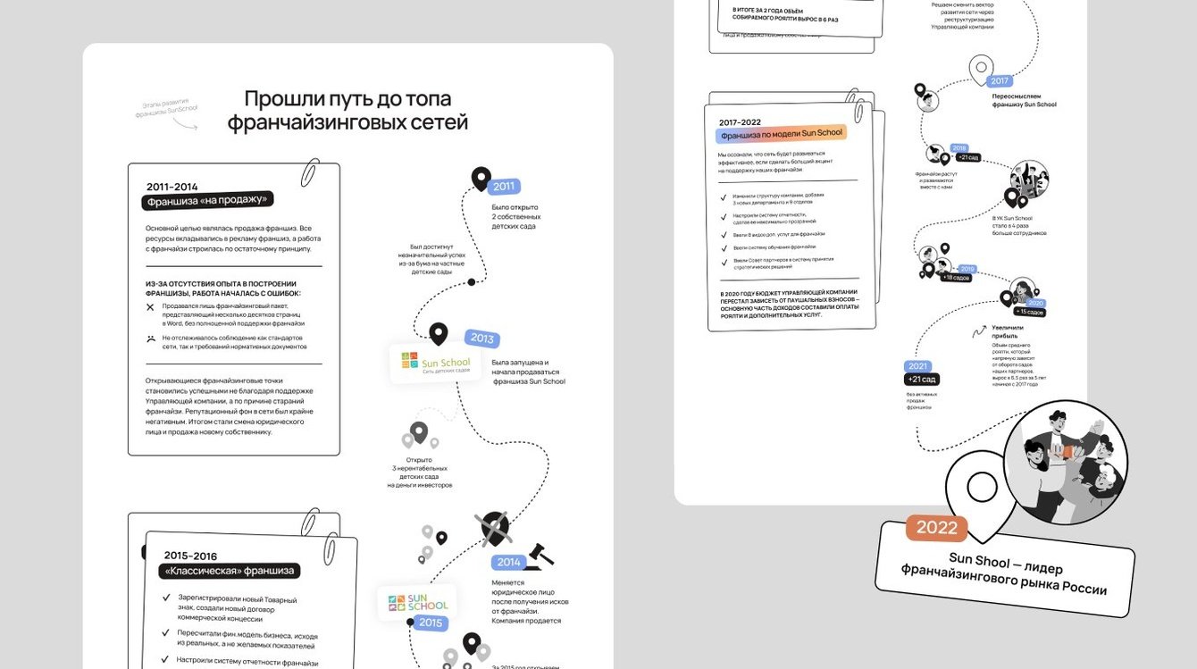 Как мы уже сказали, наличие собственного опыта в открытии франшизы — главное преимущество SunBrand. За плечами компании — 12 лет плохих и хороших решений, каждое из которых повлияло на развитие бизнеса. Просто «опустить» какой-то этап нельзя, заказчикам было важно раскрыть всю историю развития франшизы.