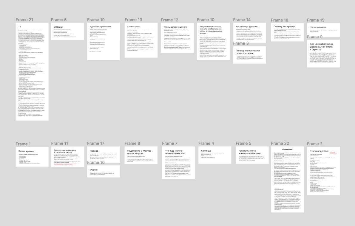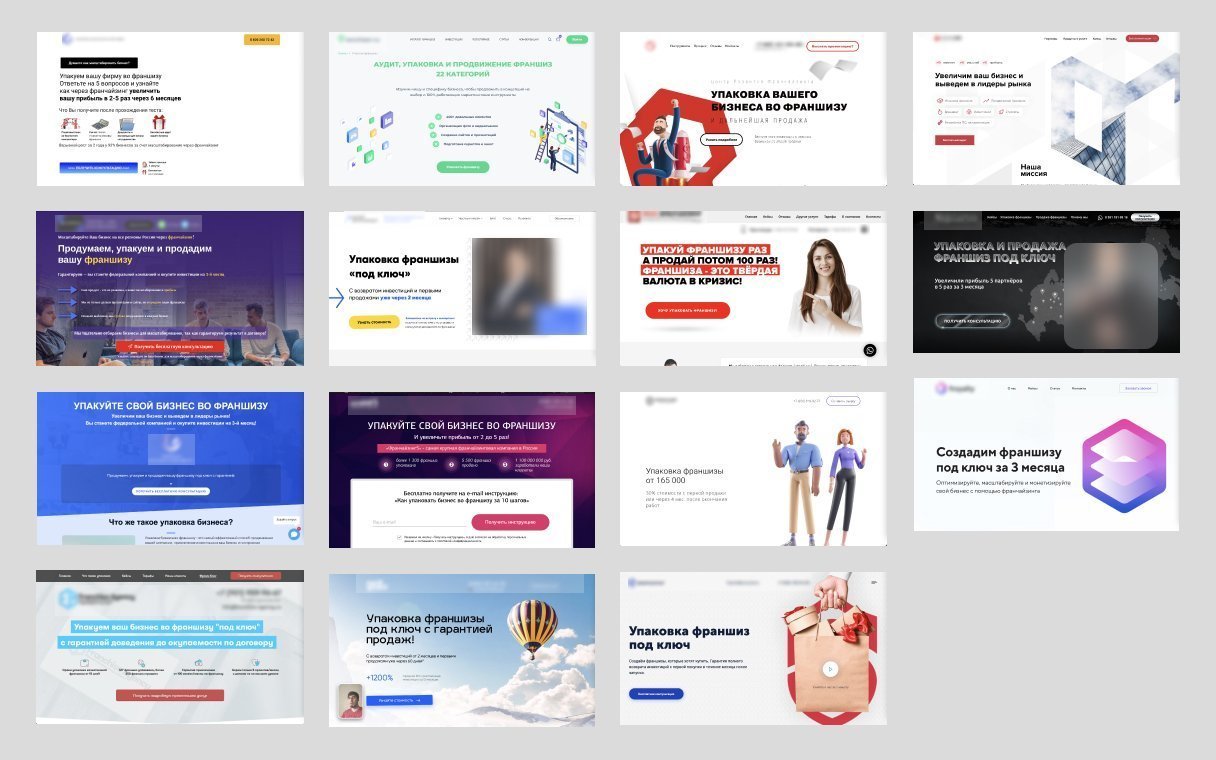 Работу над текстами мы начали с анализа конкурентов. Компаний, занимающихся упаковкой франшиз, довольно много, но все они до степени смешения похожи друг на друга: белый фон, много водного текста, мало фактов. Непонятно, как потенциальному пользователю выбрать между ними кого-то: все пишут об одном и том же и даже выглядят почти одинаково.