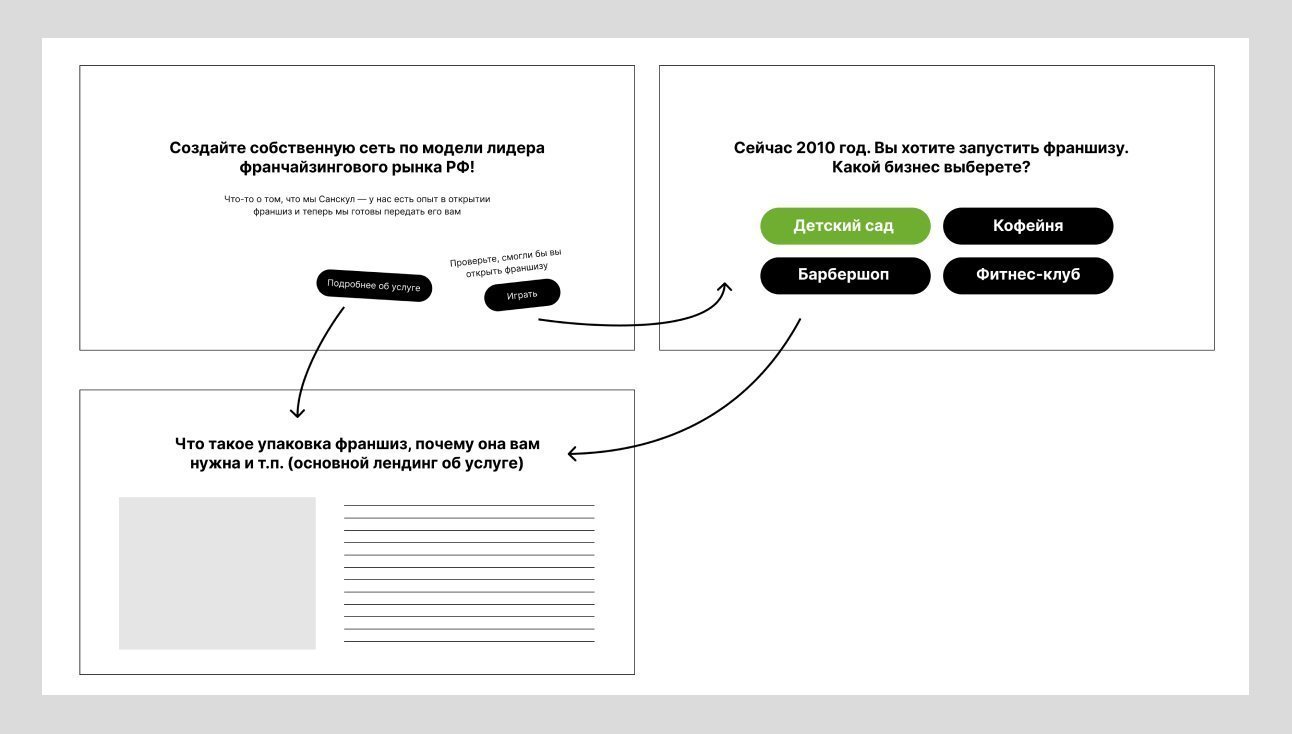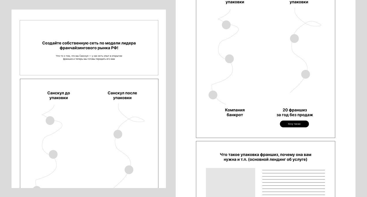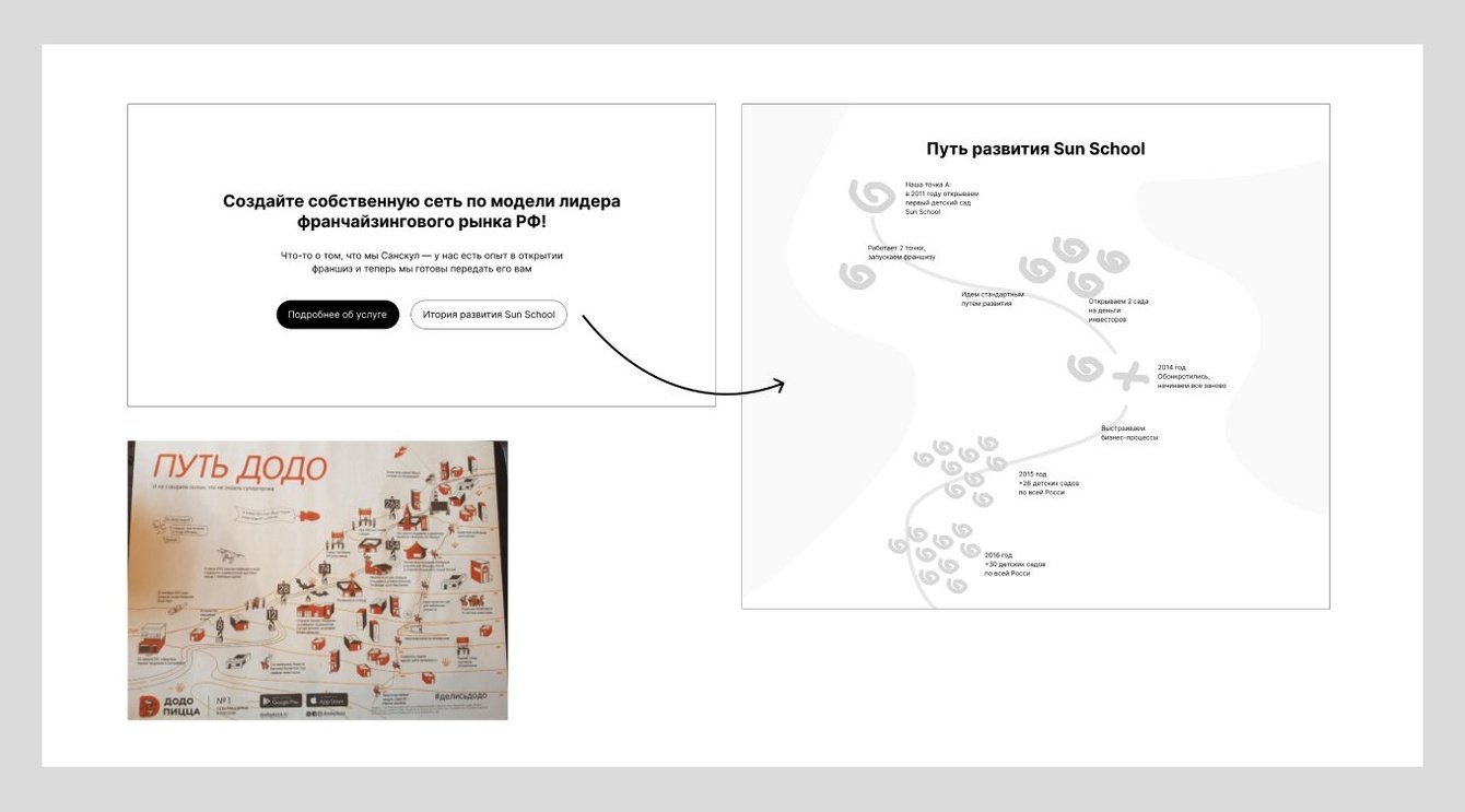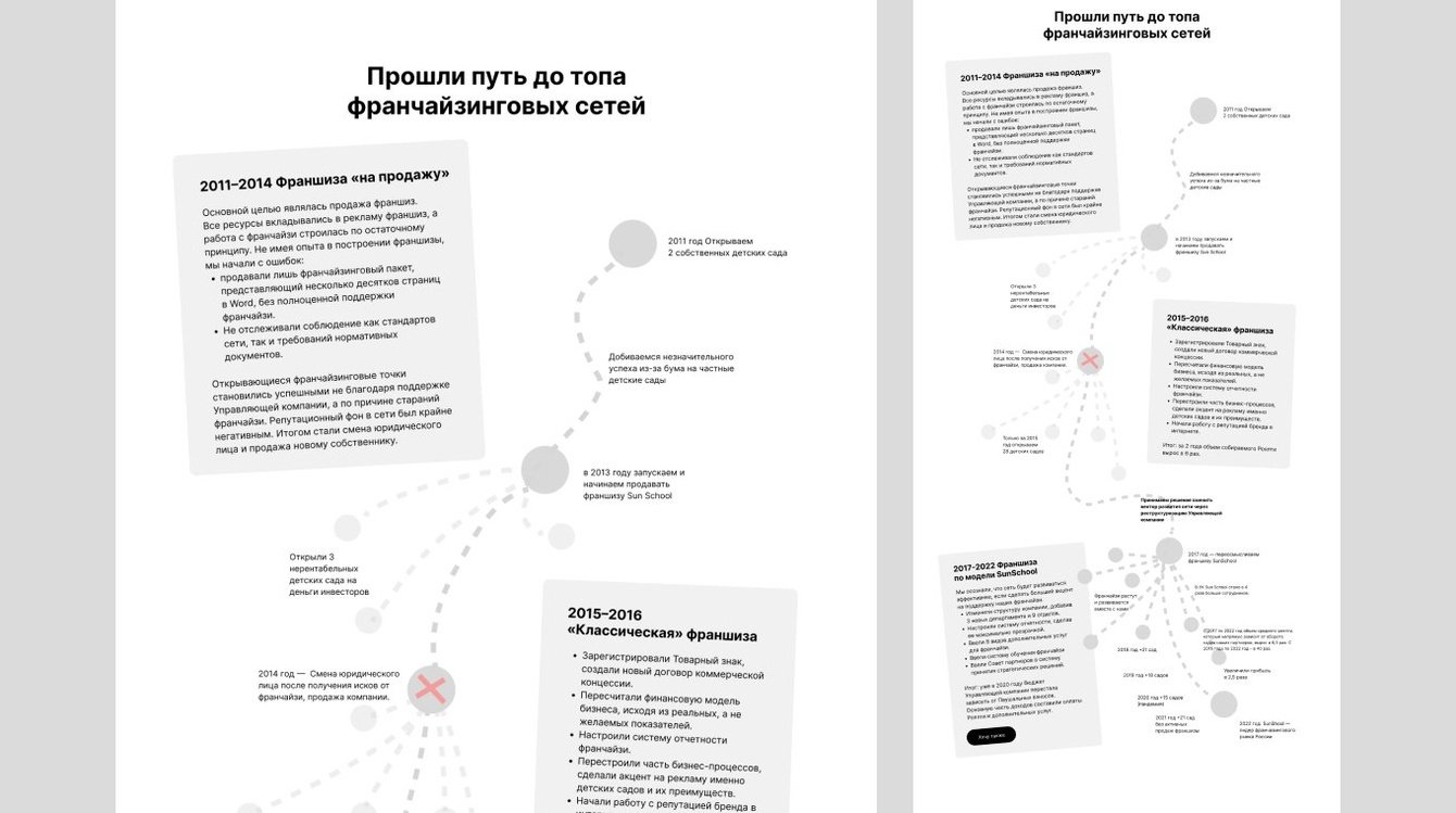 Идея: уйти от таймлайна, и вместо одного долгого пути показать два альтернативных. Экран сайта делится на две части: в левой мы показываем путь франшизы Sun School до упаковки (в конце франшиза закрывается), а в правой — путь после упаковки (в конце франшиза успешно развивается).