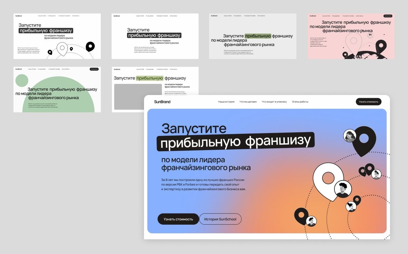 Мы со своей стороны не настаивали на каком-то конкретном варианте: мне кажется, они все достаточно интересные и могли классно развиться на сайте. Коллеги из Sun School сразу выбрали вариант 2 — им очень понравилась идея с картой развития компании.