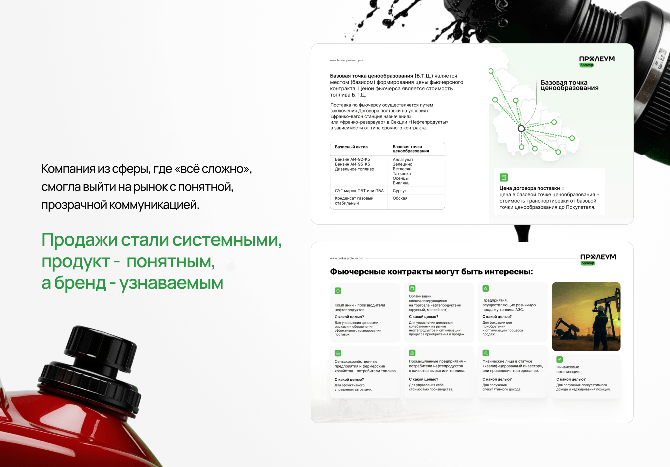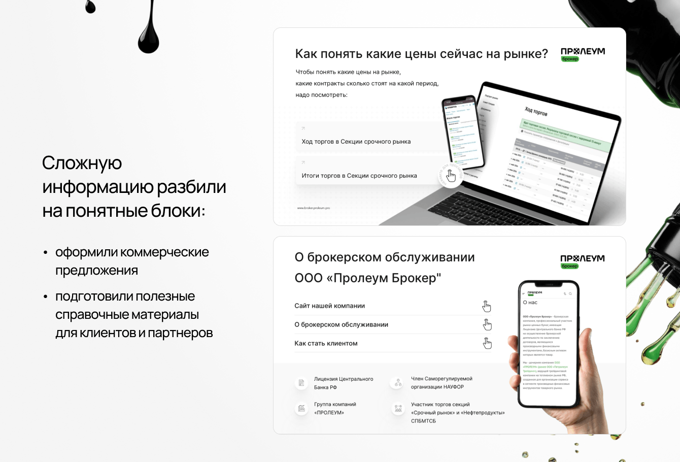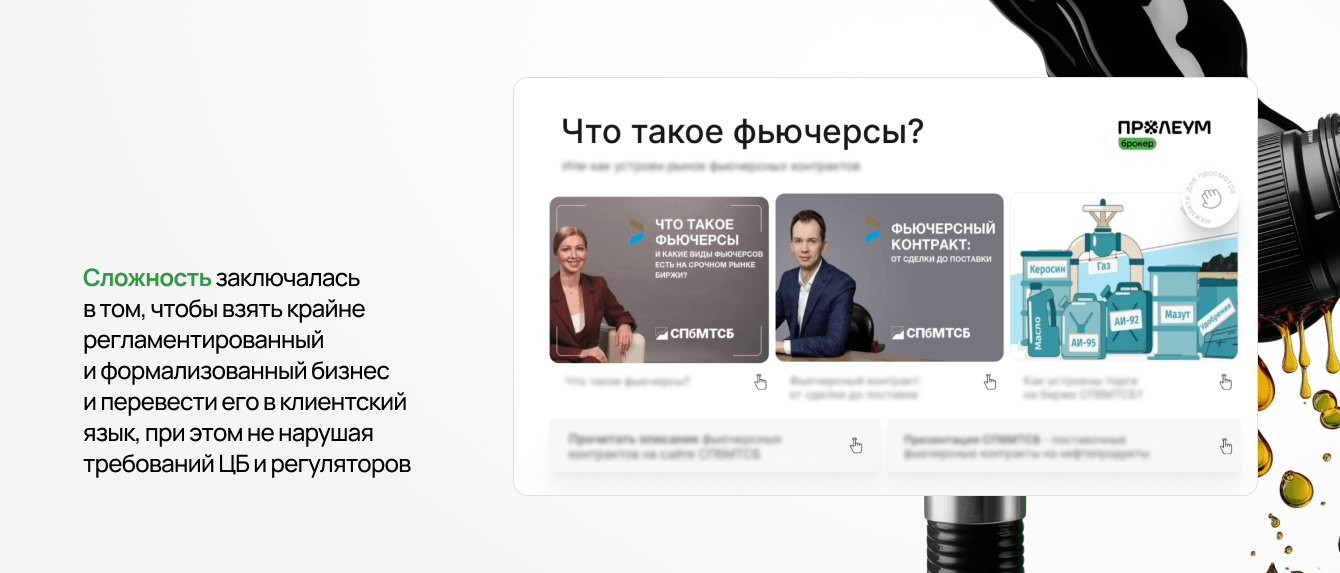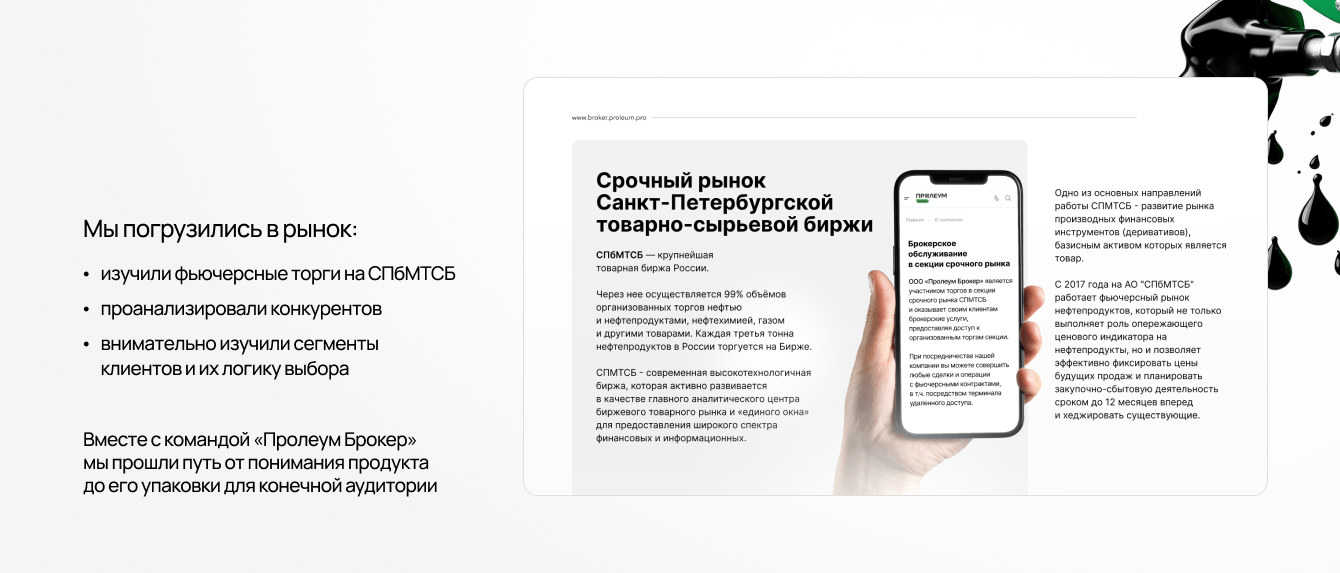 Мы погрузились в рынок: изучили фьючерсные торги на СПбМТСБ, проанализировали конкурентов, внимательно изучили сегменты клиентов и их логику выбора. Вместе с командой «Пролеум Брокер» мы прошли путь от понимания продукта до его упаковки для конечной аудитории.