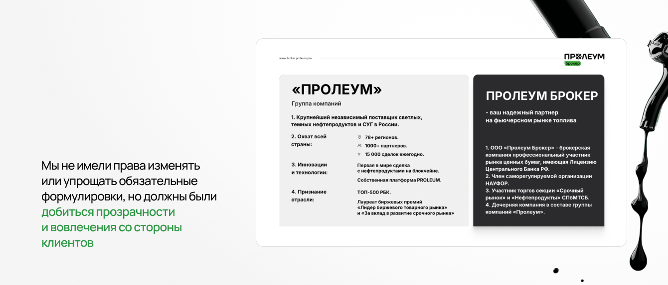 Когда к нам обратился Пролеум Брокер - молодой, но амбициозный стартап в дочерней структуре ГК «Пролеум» (экс-Петролеум Трейдинг), мы сразу поняли, что задача будет не из легких. Брокерская деятельность в сфере нефтепродуктов, фьючерсный рынок, клиринги, СВОП-контракты - всё это требовало высокой экспертизы и максимального погружения.