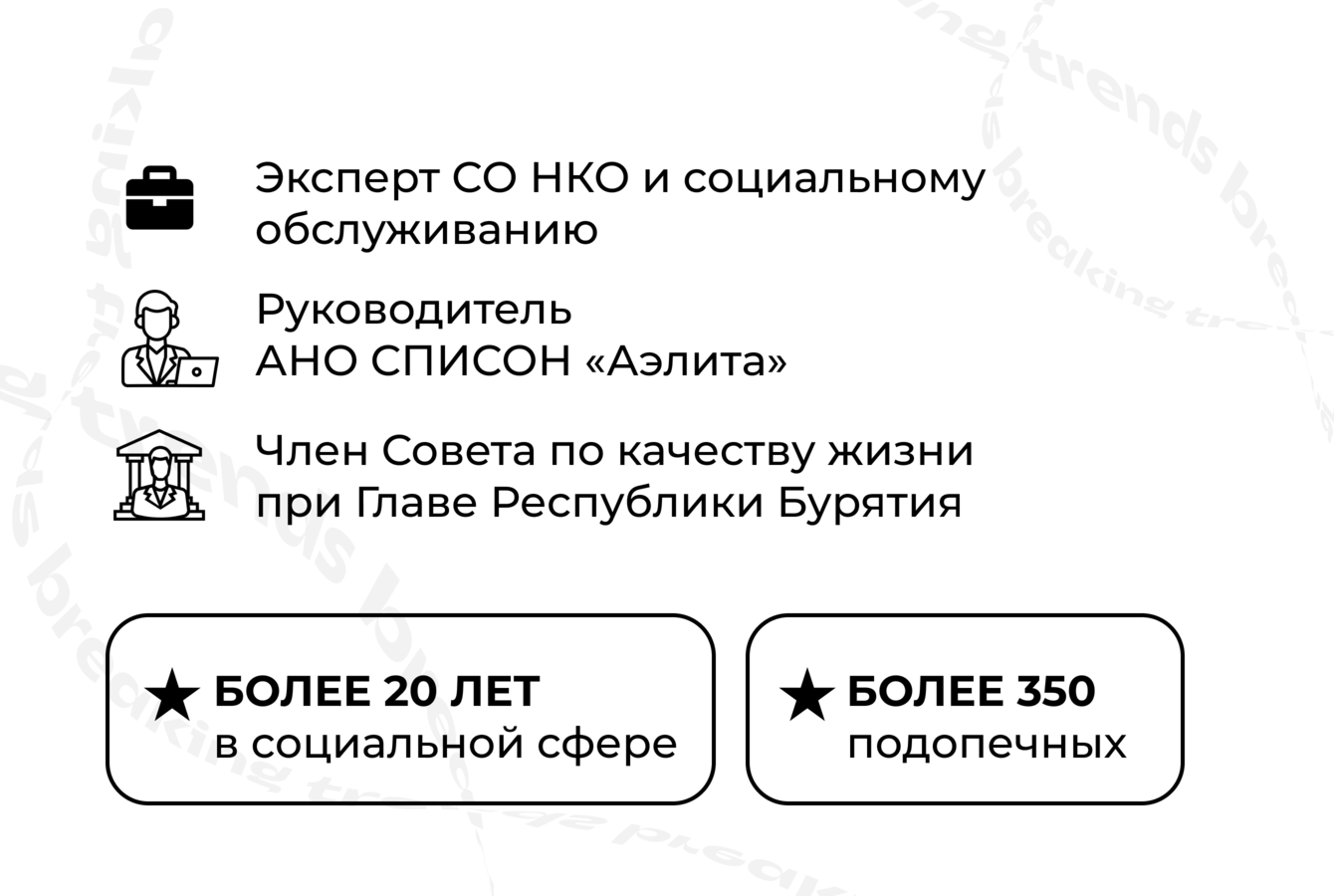 Арюна всегда стремилась помогать пожилым людям в Бурятии, их семьям и тем, кто ежедневно ухаживает за ними. Она мечтала сделать старость каждого пенсионера достойной, а труд социальных работников и сиделок — заметным и признанным обществом.