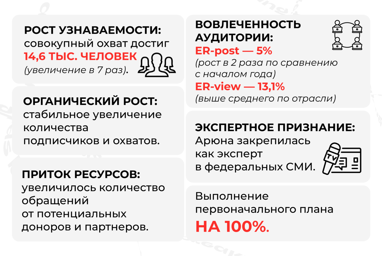 Благодаря нашему сотрудничеству вовлеченность аудитории выросла и принесла Арюне и АНО «Аэлита» узнаваемость. Руководитель АНО стала не только лицом своей компании, но и закрепилась как эксперт в федеральных СМИ.