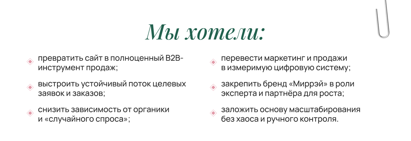 Ключевым стратегическим решением стало не просто продавать товар, а предложить клиенту результат - реальный рост бизнеса. Мы перестроили позиционирование «Миррэй» как партнера, с которым товар продаётся быстрее, ассортимент всегда в тренде, а масштабирование бизнеса становится проще и эффективнее.