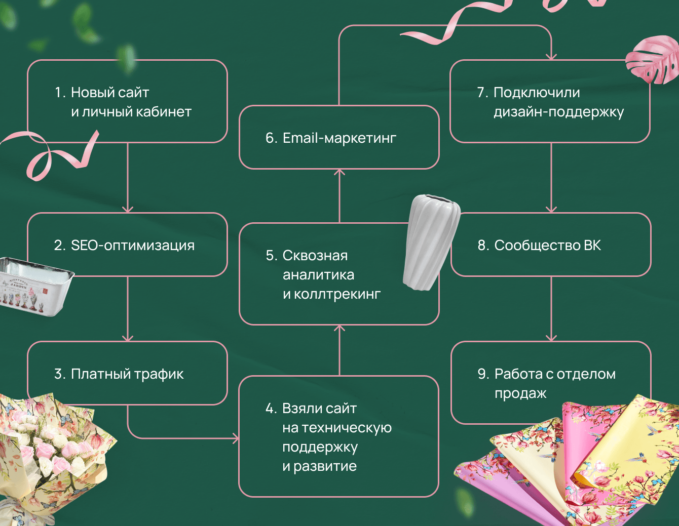 Задачей «Импульс-Маркетинг» стало пересобрать бренд так, чтобы удовлетворить все запросы клиента и выстроить маркетинговую стратегию, в которой Миррэй получил бы четкое позиционирование как оптимальная точка роста и поддержки для цветочного бизнеса.