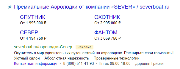 Использовали товарные объявления, чтобы привлекать внимание к конкретным моделям аэролодок. В объявлениях предоставлялась информация о цене и особенностях продукта, что помогало потенциальным клиентам сразу оценить предложения. Мы заметили, что после товарных объявлений клиенты приходили более горячими, их привлекал внешний вид и свойства лодок: