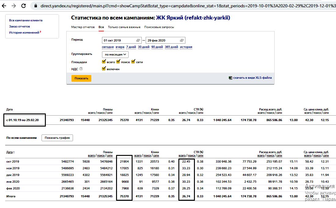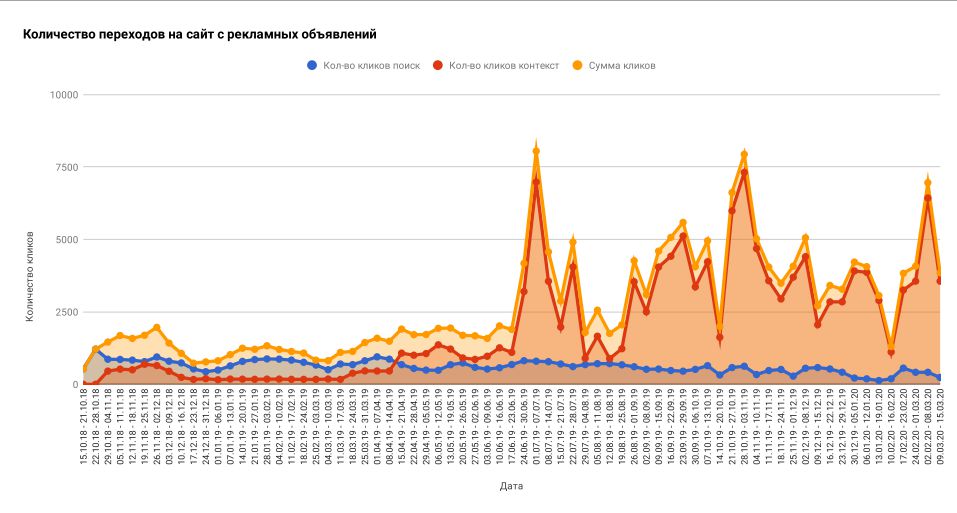 В среднем в неделю приходит порядка 100-120 лидов в пределах 1000рублей за лид. Средний CTR в контекстной рекламной кампании в поисковой рекламе - 26%.