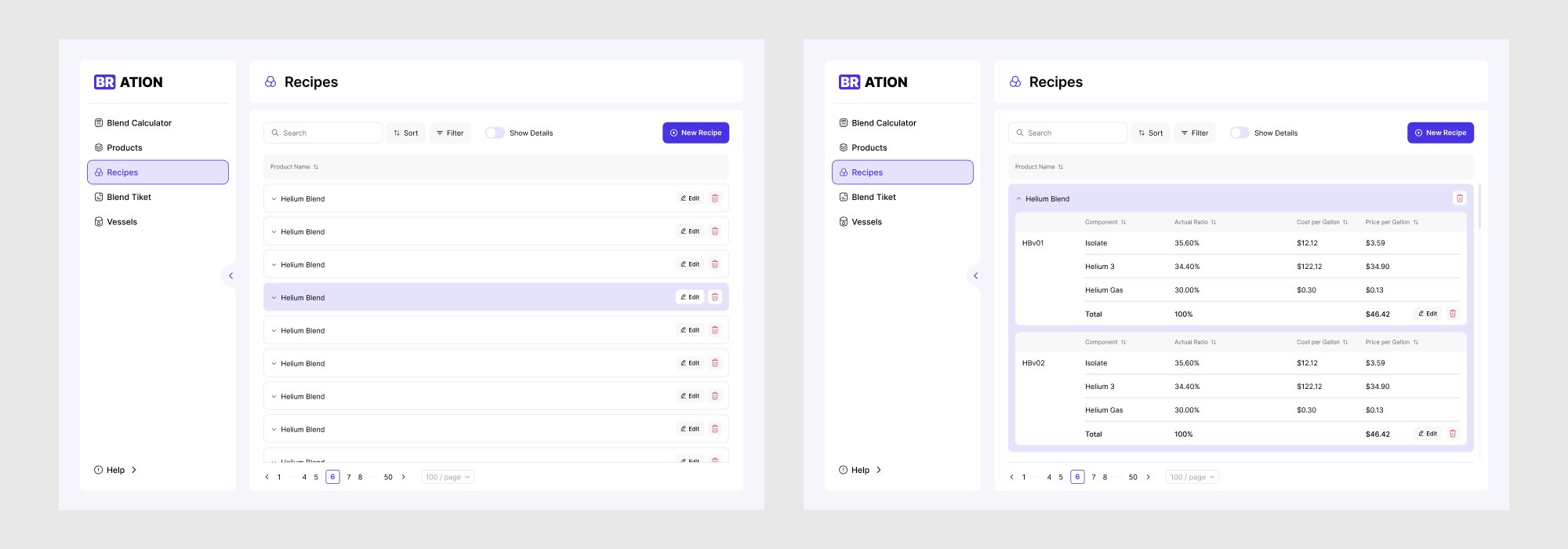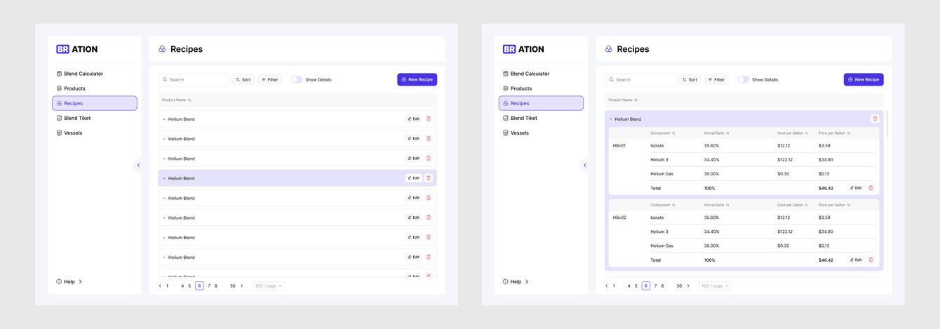 В целом интерфейс модуля получился аккуратным и понятным. В процессе разработки мы предложили разные режимы отображения карточек рецептов: от подробного (с версиями и компонентами) до лаконичного. Это облегчило работу в зависимости от целей сотрудника и уровня доступа. Так мы дополнительно разгрузили интерфейс, чтобы помочь пользователям держать фокус на главном в данный момент.