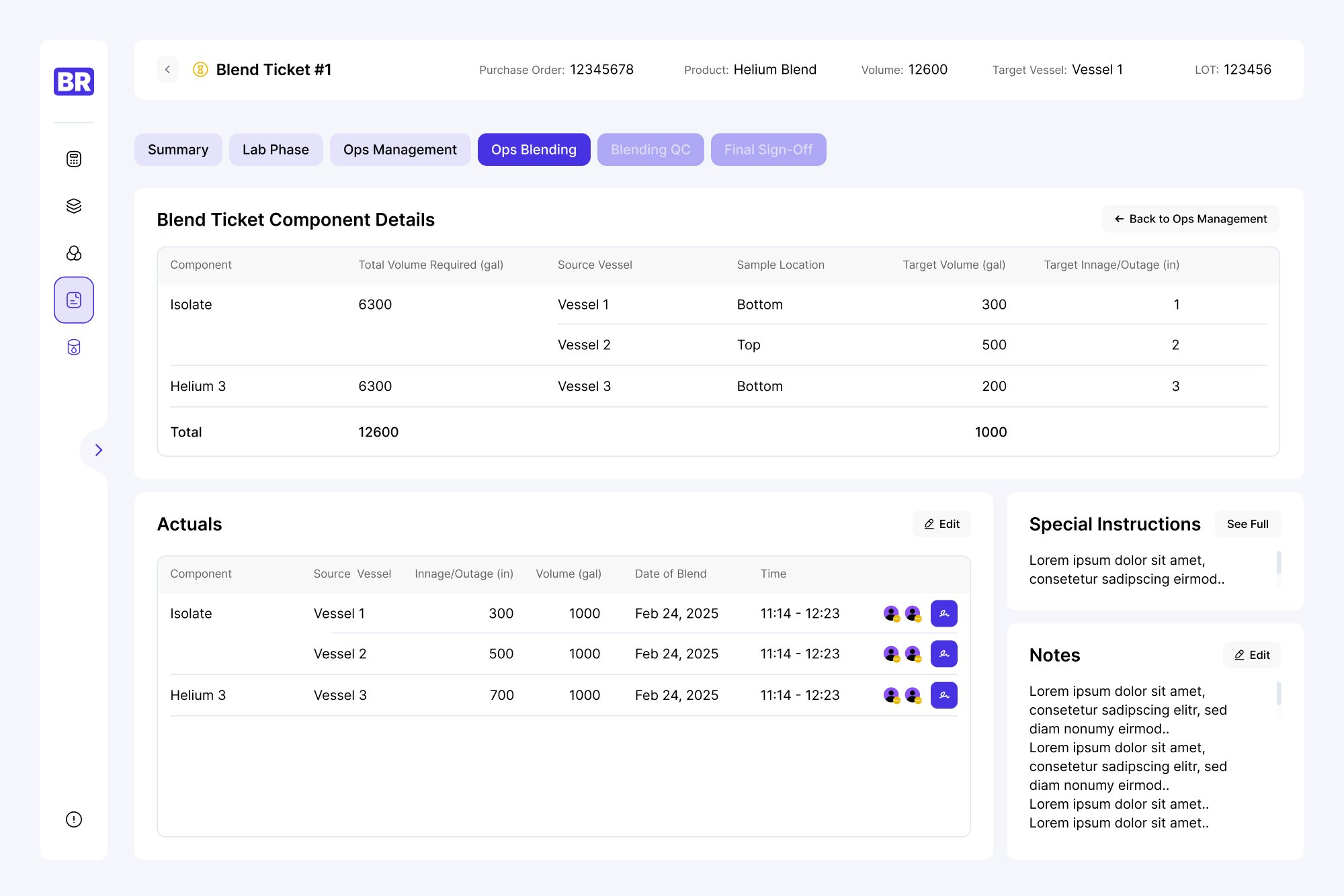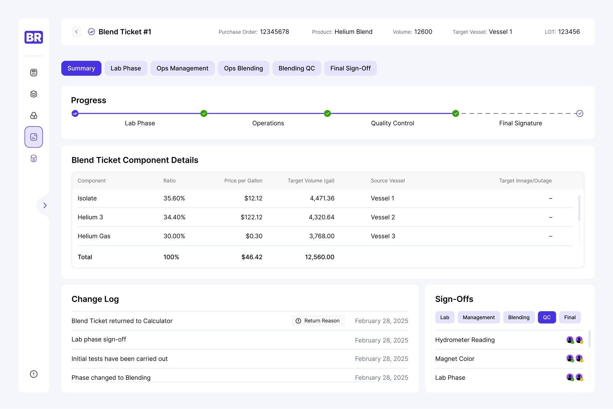 Дополнительно в этом модуле мы добавили верхнюю панель с ключевыми параметрами: номер заказа, название продукта, объем, лот. Панель сквозная и доступна на любой вкладке Blend Tocket. Это помогает быстро сориентироваться в работе, независимо от того, какой уровень доступа у сотрудника.