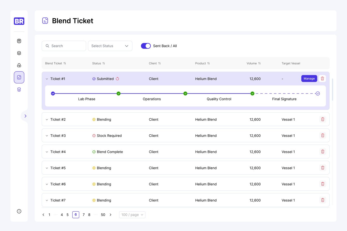 Blend Ticket устроен по принципу карточки продукта в CRM: в нем фиксируются этапы, статусы, ответственные и вся история заказа. Только вместо дизайнеров и разработчиков — лаборатория, производство, контроль качества и логистика.