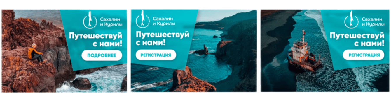 3. На основе информации предоставленной от заказчика, собрали креативы: текстово-графические объявления и анимации с рекламным призывом «Яркая зима на Сахалине», «Путешествуй с нами!», «Подари себе сказку этой зимой!», «Вас ждет великолепный Сахалин».