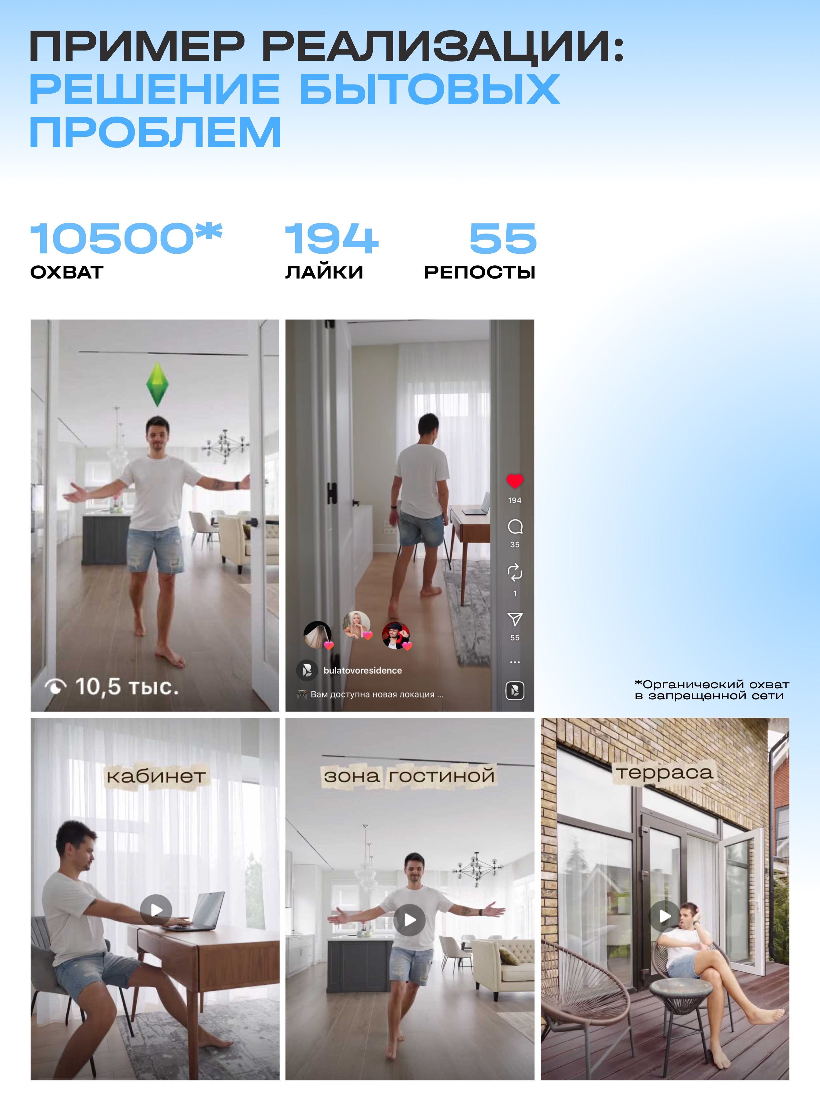 Решение бытовых проблем возможно покажется слишком примитивной темой, но при этом она самая острая и бьющая в цель. Ролик в стиле игры «The Sims» органически набрал в запрещенной сети 10,5 тыс. просмотров, поскольку динамично проиллюстрировал свободу пространства, качество отдыха на природе и визуальную эстетику домов.